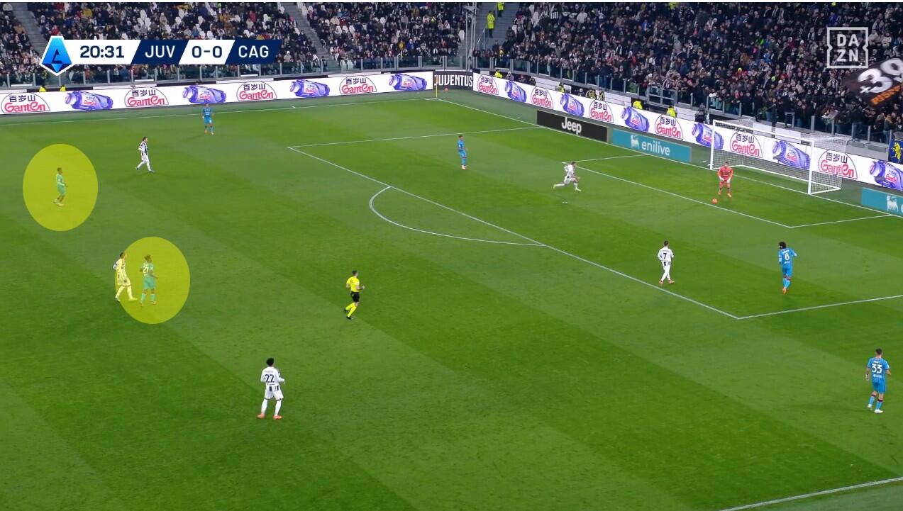 L’azione si sviluppa dalla zona destra d’attacco della Juventus e qui arriva il primo errore del Cagliari. McKennie controlla il pallone, Kalulu attacca la profondità centralmente e Obert, invece che concedere la fascia alla corsa di Conceicao, lascia libera l’opzione di giocata dentro il campo dell’americano verso il braccetto che si muove senza palla. Allo stesso modo Liteta abbandona il compito di mediano davanti alla difesa per seguire uomo su uomo il taglio proprio di Conceicao, con Luperto che avrebbe potuto controllare il portoghese senza che il compagno lasciasse libera la zona di rifinitura centrale.