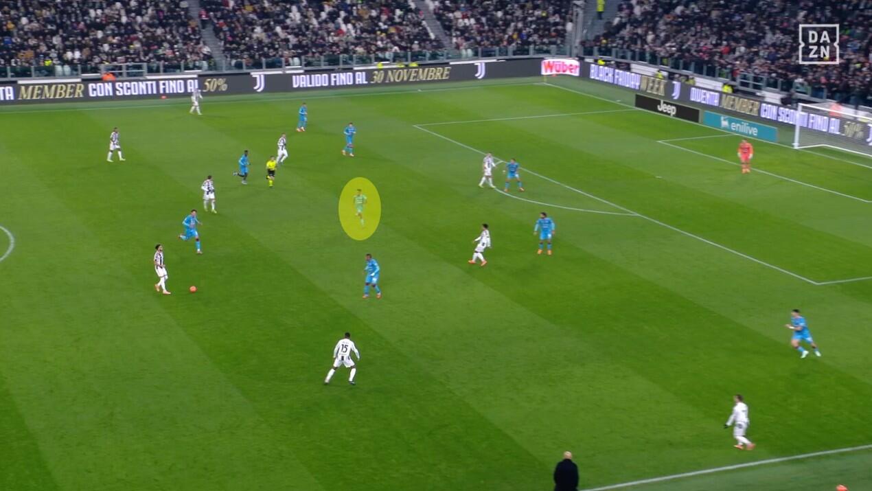 Locatelli, in posizione di regista basso, viene pressato da Folorunsho ma ha lo spazio per trovare in verticale McKennie che ha in Luperto il suo marcatore. L’aspetto fondamentale è però ciò che accade centralmente, con la zona di rifinitura scoperta. Liteta è infatti dieci metri più alto rispetto alla posizione di mediano schermo, Adopo in linea con lui ha piena visuale del gioco e può vedere Yildiz davanti a lui e alle spalle del compagno. Zappa, normalmente pronto a rompere la linea, tiene la posizione di braccetto alla destra di Deiola, con il turco che è dunque completamente libero di attaccare lo spazio tra le linee.