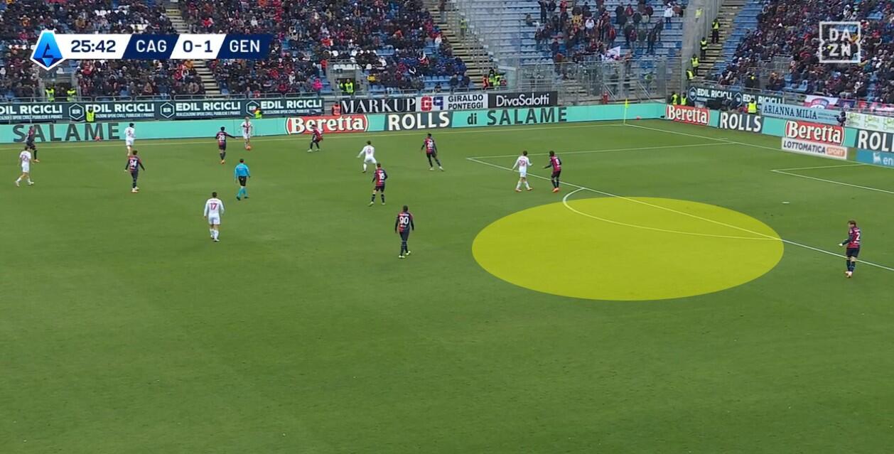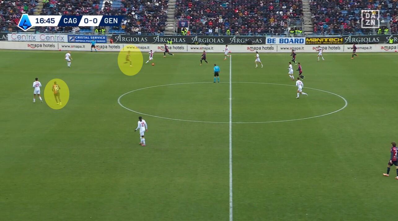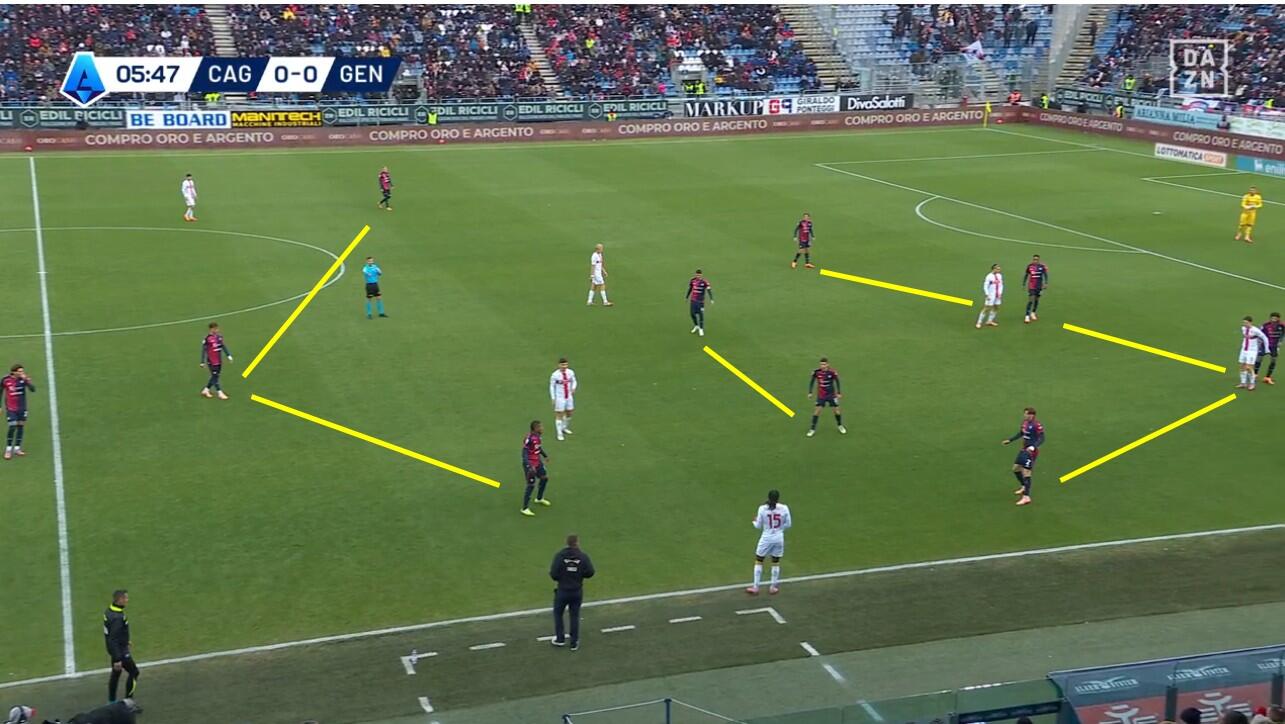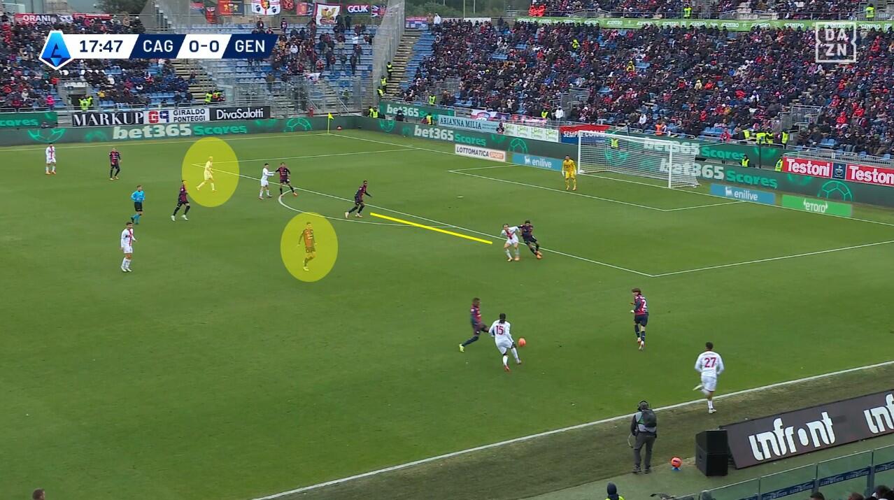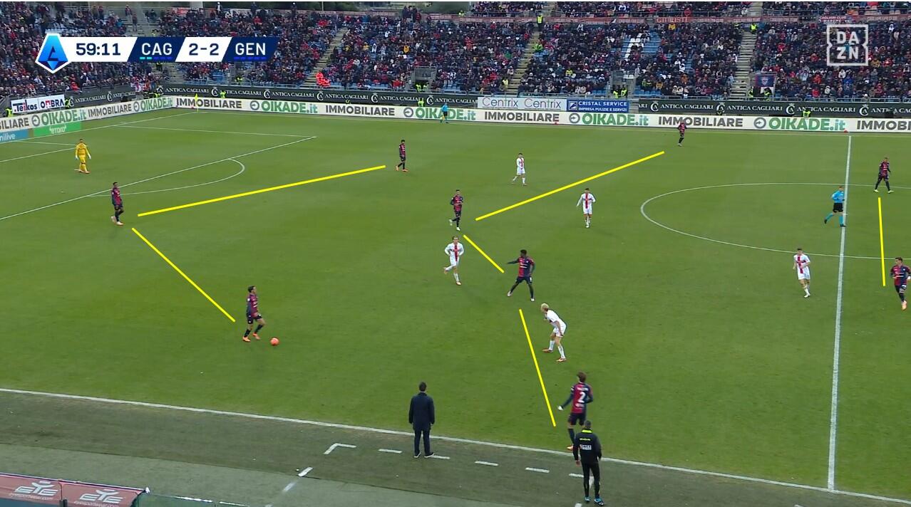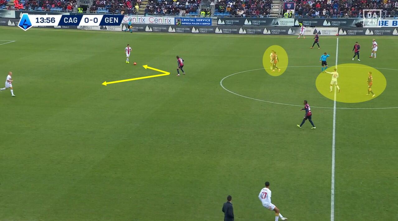 Con il Genoa in costruzione, il Cagliari abbinava un blocco relativamente basso – e dunque il 4-2-3-1 – a una pressione più alta uomo su uomo nella quale Borrelli andava a schermare due dei tre centrali, Folorunsho si abbinava al braccetto di destra Marcandalli, Felici andava su MartÃn ed Esposito su Frendrup. La scelta differente rispetto al passato riguardava Prati, non mediano davanti alla difesa a controllo della zona di rifinitura, ma alto in pressione su Malinovskyi, con Deiola che restava su Thorsby per contrastarne la bravura sui palloni alti.