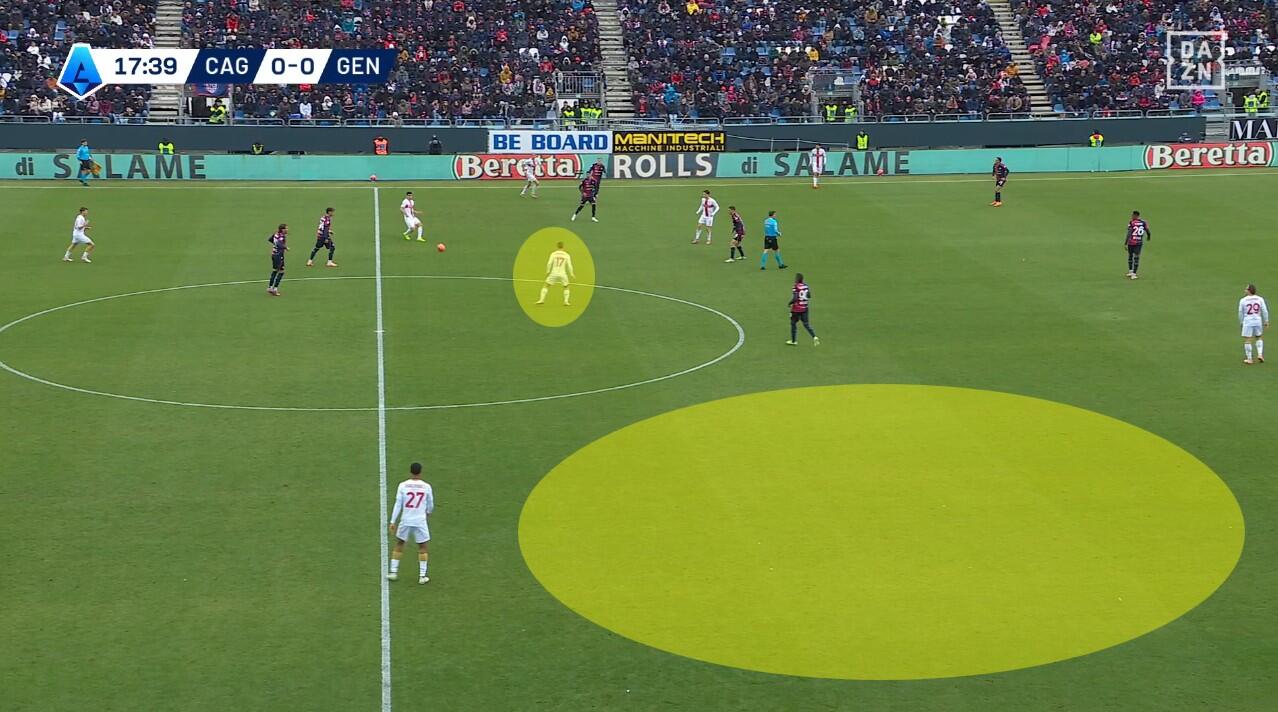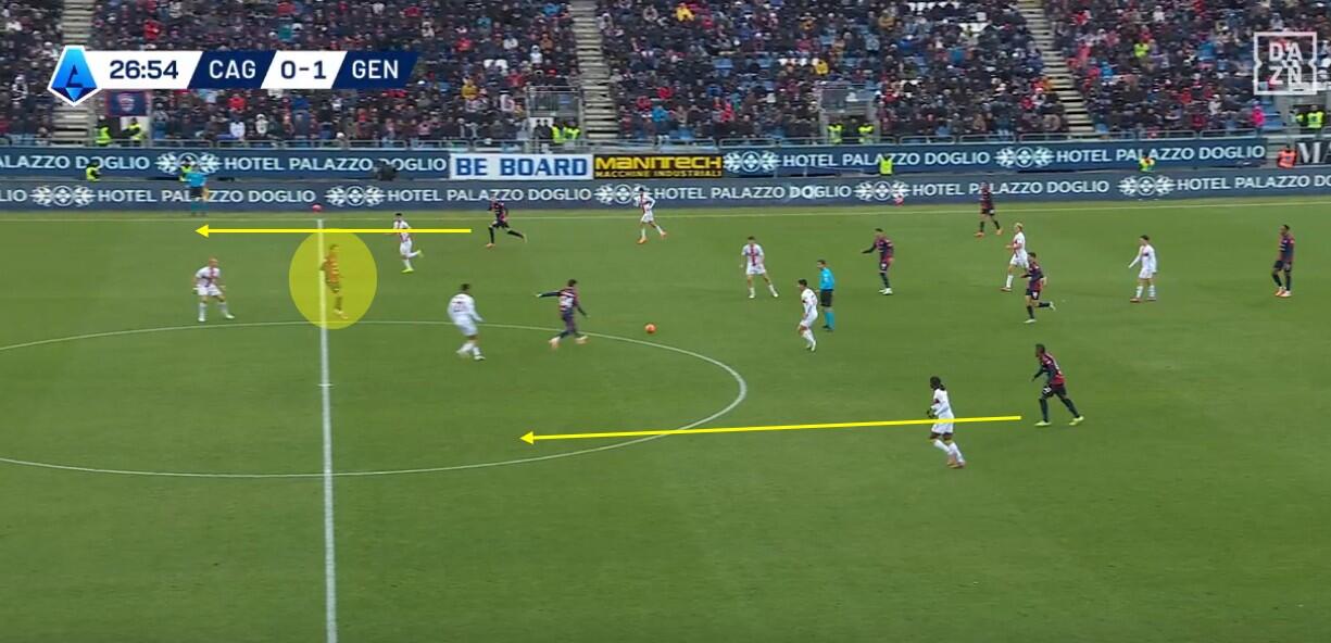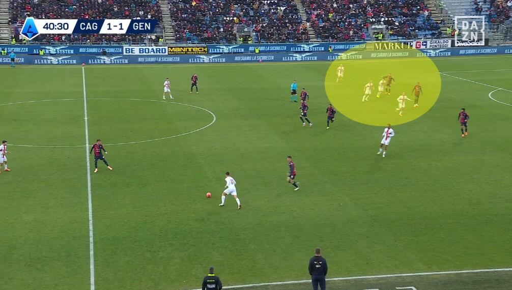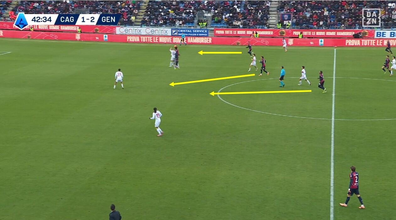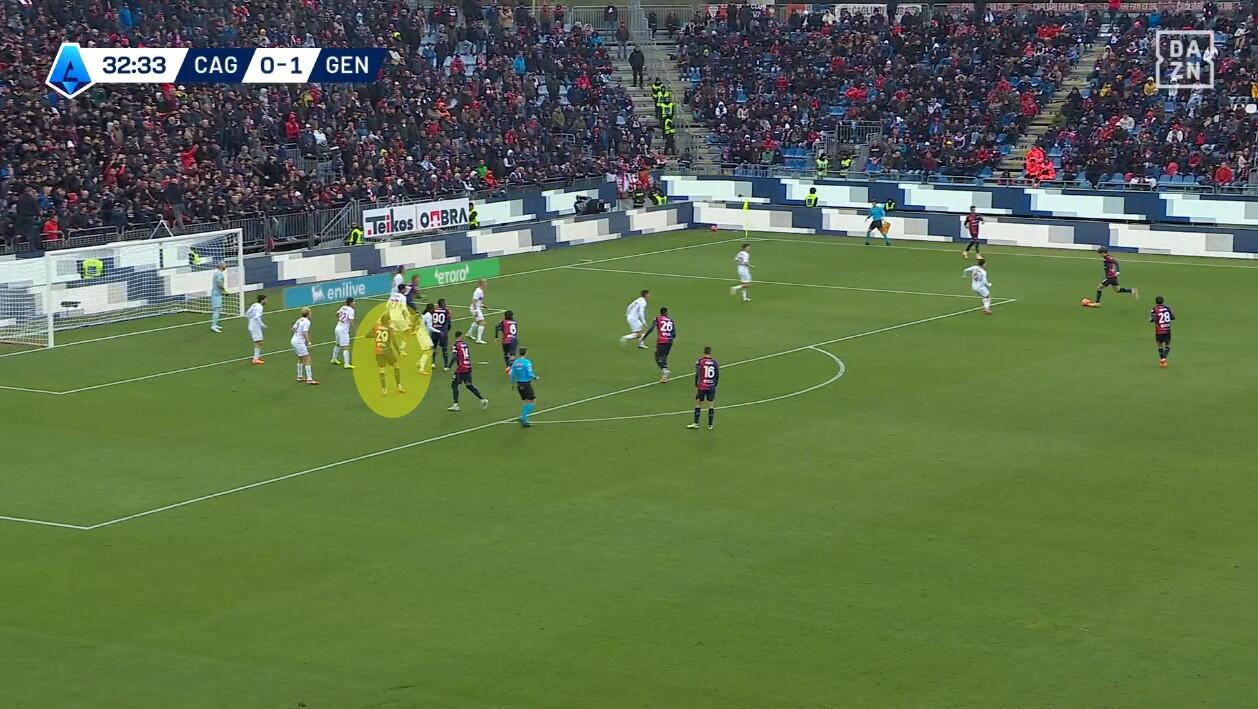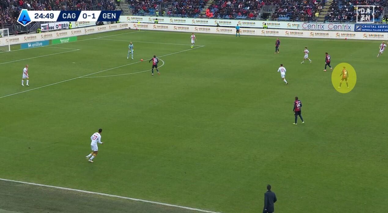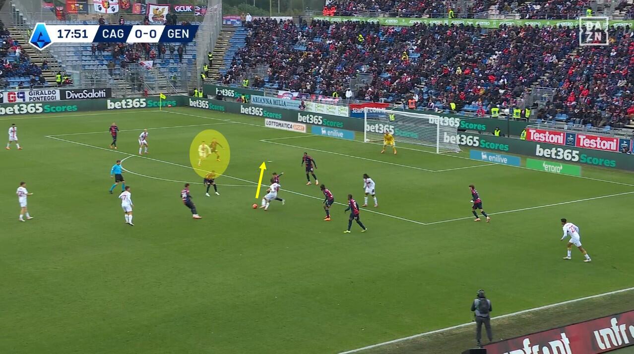 Con il Genoa in costruzione, il Cagliari abbinava un blocco relativamente basso – e dunque il 4-2-3-1 – a una pressione più alta uomo su uomo nella quale Borrelli andava a schermare due dei tre centrali, Folorunsho si abbinava al braccetto di destra Marcandalli, Felici andava su MartÃn ed Esposito su Frendrup. La scelta differente rispetto al passato riguardava Prati, non mediano davanti alla difesa a controllo della zona di rifinitura, ma alto in pressione su Malinovskyi, con Deiola che restava su Thorsby per contrastarne la bravura sui palloni alti.