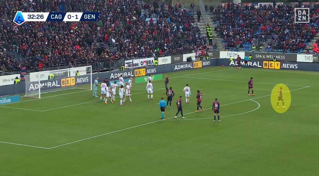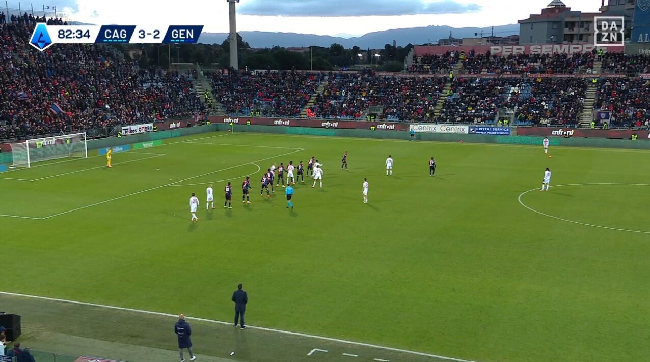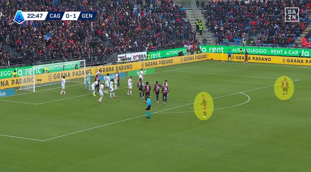 Già prima del gol del primo pareggio firmato da Borrelli il Cagliari aveva messo in mostra un limite della difesa del Genoa sui calci d’angolo. De Rossi, forse preoccupato per la fisicità dei padroni di casa, aveva scelto un classico castello davanti a Leali senza che nessuno dei suoi giocatori si preoccupasse del limite dell’area. Con, dunque, Prati e Palestra liberissimi sia per l’eventuale respinta sia per un passaggio diretto da parte del tiratore dalla bandierina.