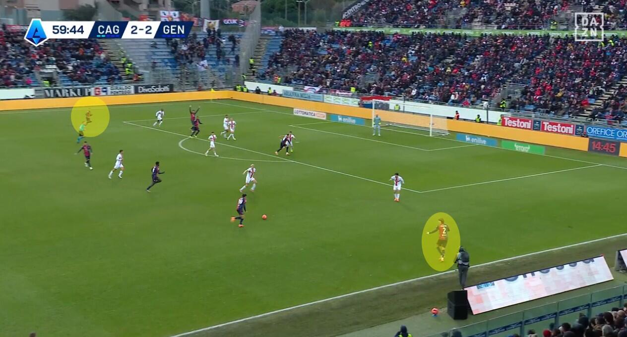 Il gol del secondo pareggio del Cagliari arriva proprio a seguito della strategia descritta. C’è sicuramente tanto demerito di un Genoa distratto dopo aver appena segnato il gol del secondo vantaggio, ma c’è anche una delle poche spizzate riuscite di Borrelli che trova alle proprie spalle l’inserimento di Deiola, bravo poi ad assecondare Esposito pronto ad accompagnare l’azione come invasore.