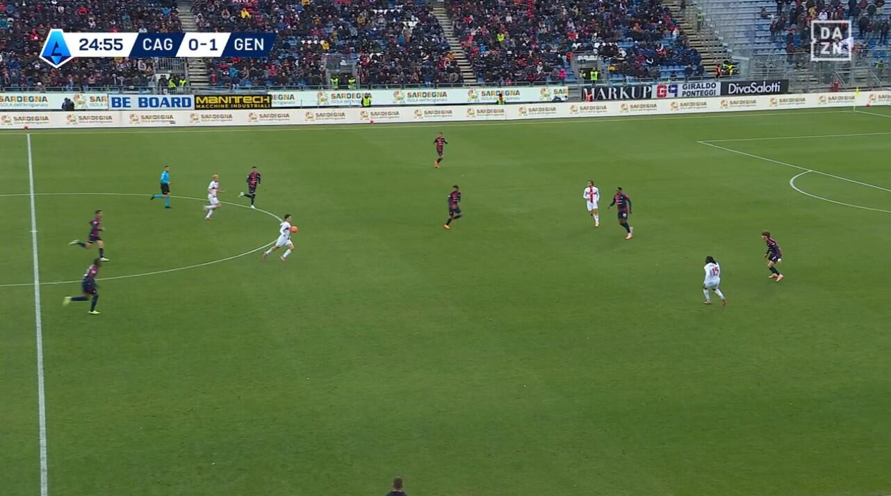 La strategia del Cagliari in fase offensiva ha avuto come costante la ricerca di Borrelli sia con palloni a terra che con, soprattutto, palloni alti. Il centravanti usciva dalla linea della difesa del Genoa andando verso la propria metà campo così da aprire lo spazio alle proprie spalle per gli inserimenti dei vari Esposito, Felici, Folorunsho e all’occorrenza di Deiola. Se da una parte questo ha portato a conseguenze negative – le transizioni negative che trovavano la metà campo scoperta e la squadra troppo lunga – dall’altro hanno permesso di mettere in difficoltà gli avversari sia con occasioni concrete sia con alcune potenziali, rimaste tali per la scelte errate di Felici in zona di rifinitura.
