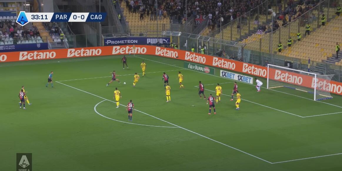 Non una sorpresa, ma una modifica ampiamente annunciata già dalla vittoria in Coppa Italia contro la Cremonese. Il Cagliari ha cambiato pelle, non più difesa a tre e centrocampo a cinque, ma una retroguardia a quattro con una mediana sulla stessa falsariga e il trequartista a supporto della punta centrale. Schieramento comunque flessibile, grazie al lavoro sugli esterni sia bassi che alti e all’intelligenza tattica del numero dieci, nello specifico Viola. Fino alla fase finale che ha visto Nicola riportare la linea a tre davanti a Scuffet, ricevendo risposte positive anche dopo questa modifica. La chiave della vittoria rossoblù è stata senza dubbio il centrocampo, non solo per la fisicità del duo Makoumbou-Adopo, quanto soprattutto per il lavoro di Viola. Sorprendentemente più come schermo in fase di non possesso che come regista offensivo. Non che sia mancato il secondo aspetto, anzi, ma la capacità del numero 10 calabrese di coprire sul creatore di gioco del Parma Bernabé – insieme alla presenza di un uomo in più in mediana quando necessario – ha permesso al Cagliari di dominare nella zona centrale del campo per tutto il primo tempo.