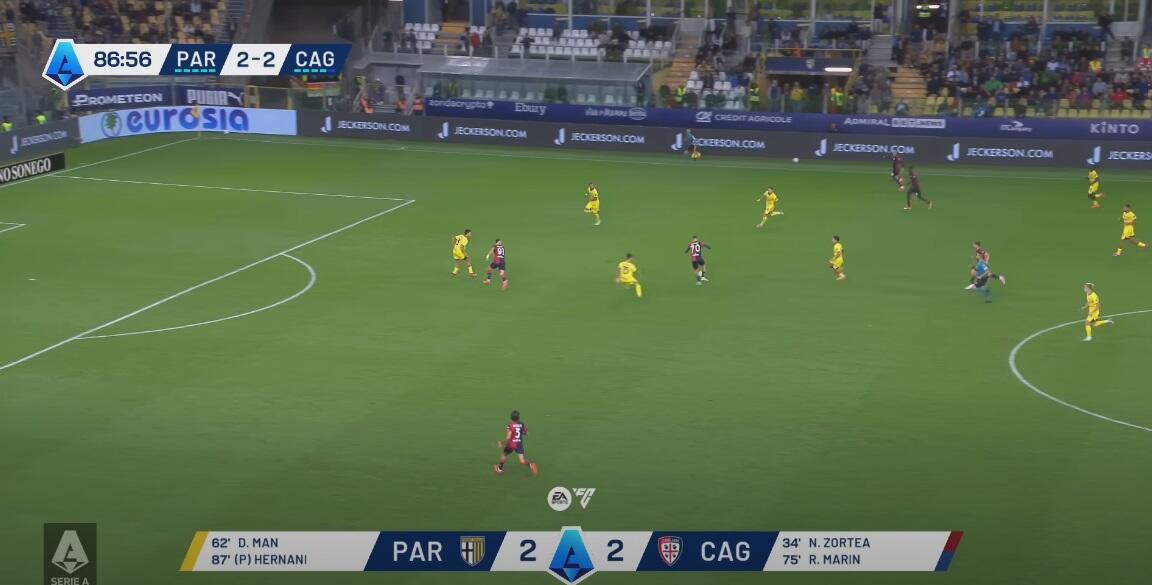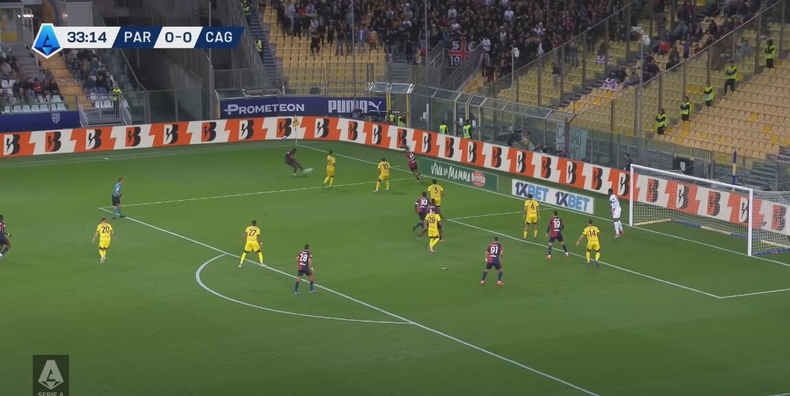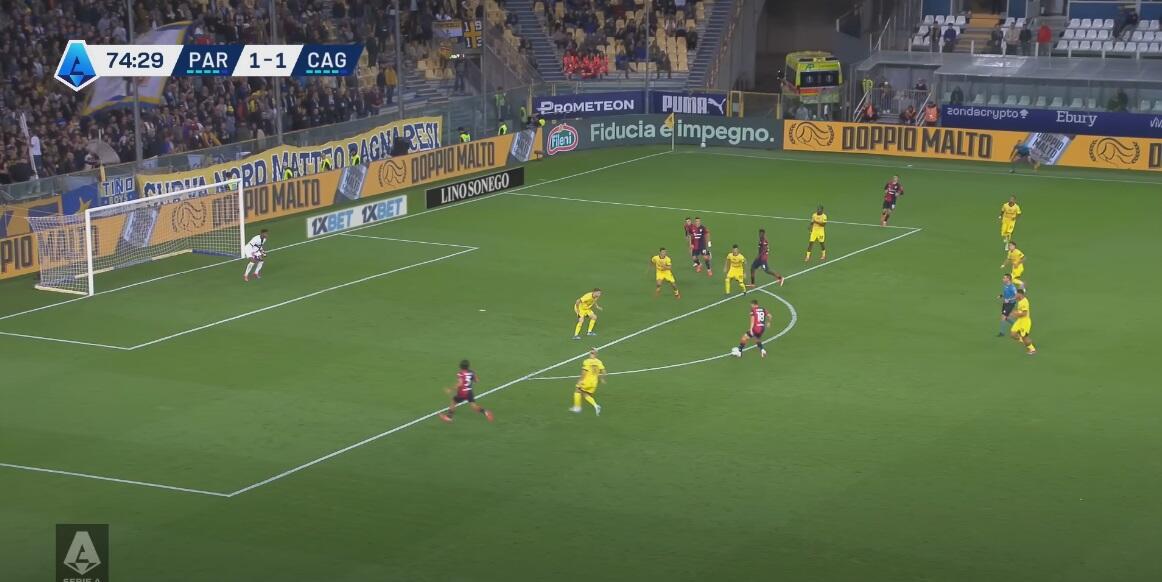 Il gol del vantaggio firmato da Zortea è arrivato dopo un dominio territoriale evidente, con il Cagliari capace di riempire costantemente l’area avversaria con tanti uomini senza perdere in compattezza nelle poche transizioni del Parma. Quando l’azione si sviluppa nel lato sinistro dell’area di rigore ducale, sono cinque i rossoblù dentro i sedici metri più due in supporto tra esterno e limite. La presenza di Obert, scelto da Nicola al posto di Augello, e quella di Adopo come incursore, hanno dato al Cagliari freschezza e tecnica. La posizione da ala destra di Zortea ha permesso di avere uno sfogo sulla fascia simile se non superiore a quello dato da un Luvumbo non in grande serata, ma comunque decisivo con l’assist per il momentaneo 0-1.