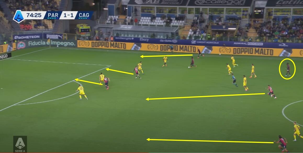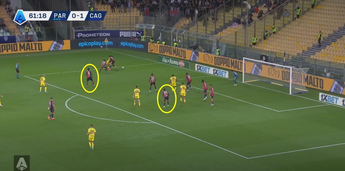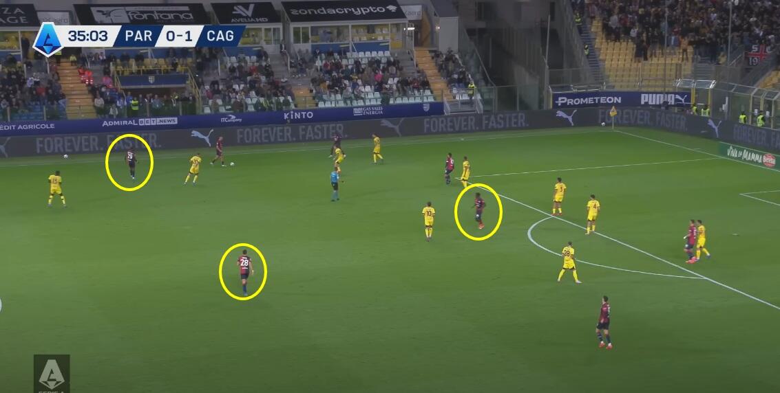 A fare la differenza tra Cagliari e Parma è stata non solo la prestazione degli interpreti e in questo la scelta di confermare il duo Makoumbou-Adopo ha avuto un peso fondamentale. A segnare il solco tra padroni di casa e ospiti è stata la qualità della corsa, con una copertura totale del campo e non uno schieramento spezzato in due come quello gialloblù.