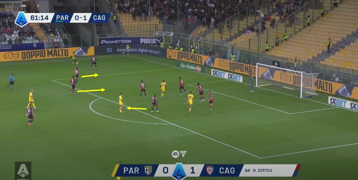 Una volta che Coulibaly ha saltato Zortea tutti i nodi dell’atteggiamento dei tre giocatori indicati vengono al pettine. Il terzino sinistro del Parma è libero di scegliere se mettere la sfera in orizzontale o verso i sedici metri perché Zappa non ha supportato il compagno e perché Adopo non ha chiuso l’unica linea aperta, Man è senza uomo a disturbarlo e può chiamare il pallone su di sé perché Luvumbo non ha compiuto la scelta difensiva corretta, andando a dare maggiore densità in una zona dell’area già ampiamente difesa dai compagni. Il gol, frutto anche delle qualità tecniche di Man, diventa una conseguenza quasi ovvia.