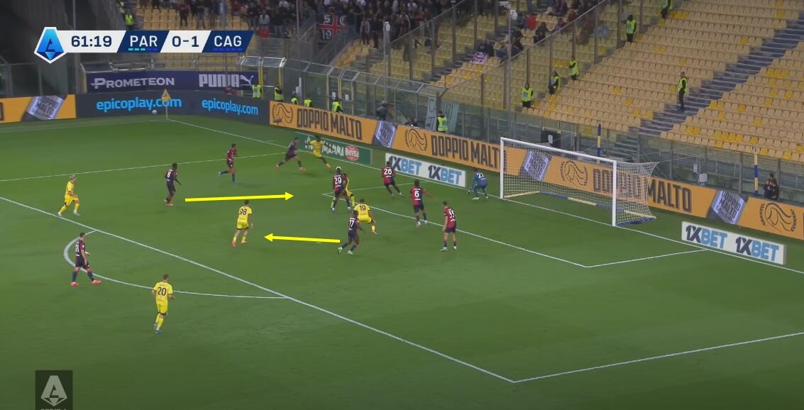 Nella rete dell’1-1 firmata da Man ci sono diverse situazioni da segnalare. Intanto un Zortea con il fiato corto che ha pagato lo scotto dell’ingresso del più fresco Coulibaly. Poi Zappa che tentenna nel dargli supporto nell’uno contro uno, costringendo così il compagno a lasciare il fondo all’avversario senza poter indirizzare diversamente la giocata. In mezzo non capiscono il pericolo in arrivo né Luvumbo né Adopo. Il primo, pur non essendo il suo compito naturale, sarebbe l’uomo designato a seguire Man nell’eventuale e leggibile palla all’indietro di Coulibaly. Con una difesa che, fisiologicamente, è portata a scappare verso la porta per evitare il pallone orizzontale. Adopo, dal canto suo, avrebbe tutto il tempo di andare a coprire la zona vuota dentro i sedici metri chiudendo l’unica linea di passaggio aperta per l’esterno sinistro del Parma.