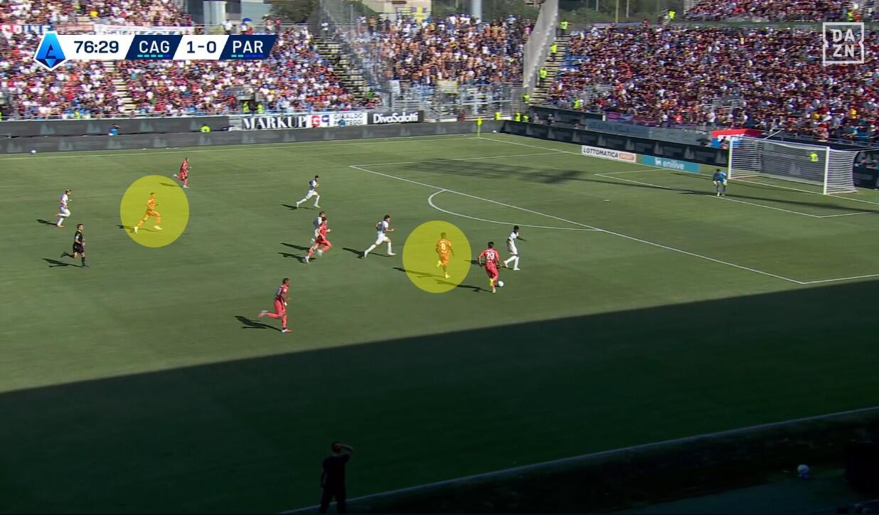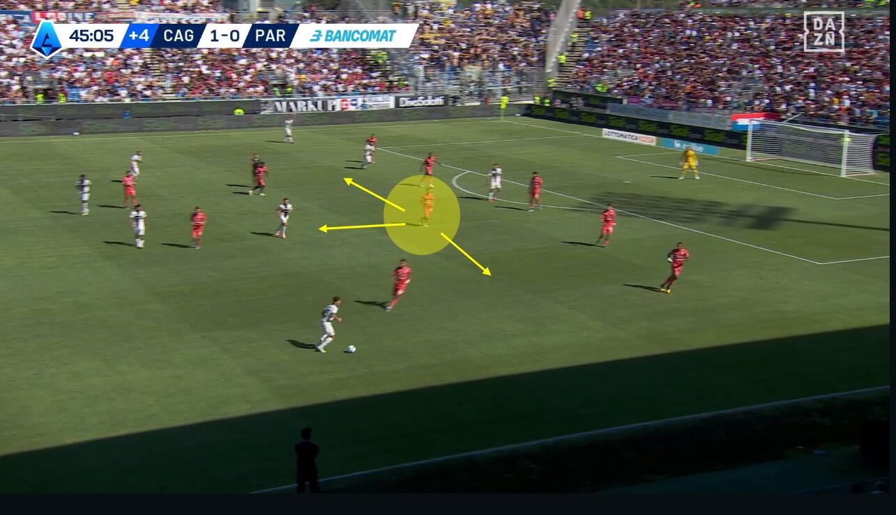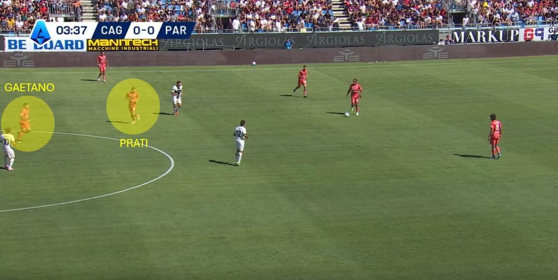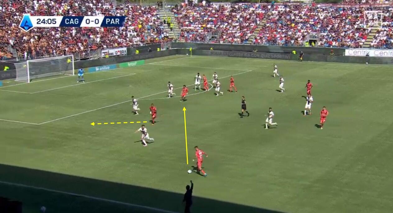 Una delle costanti del Cagliari in costruzione è stata quella del riferimento in regia non statico. Prati come mediano davanti alla difesa in non possesso, ma non unico play designato in quella di possesso. In un calcio che vive di compiti più che di ruoli e nel quale le rotazioni degli interpreti sono quasi la norma, il classe 2003 ravennate è stato spesso il giocatore che dava opzioni in uscita, ma senza limitarsi al lavoro di appoggio. La caratteristica del Cagliari contro il Parma è stata infatti quella dello svuotamento da parte di Prati della zona davanti alla difesa, creando così lo spazio per i movimenti verso la mediana di Gaetano ed Esposito a turno, spesso e volentieri registi occulti nella manovra.