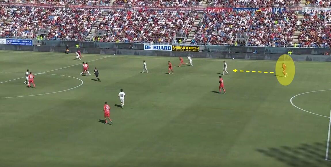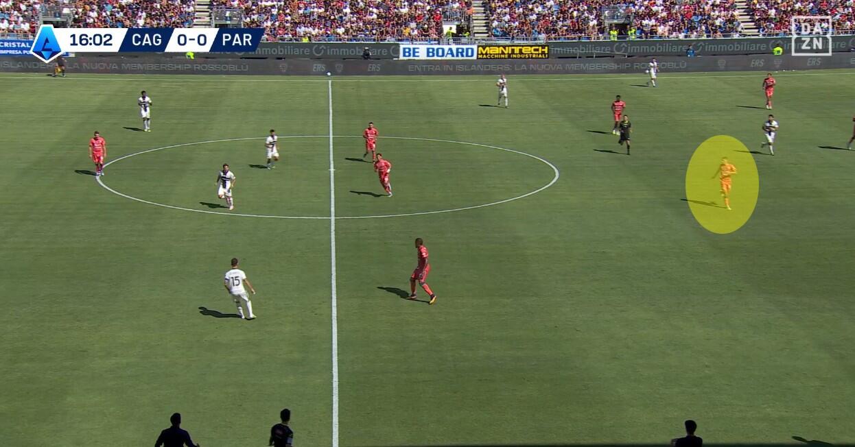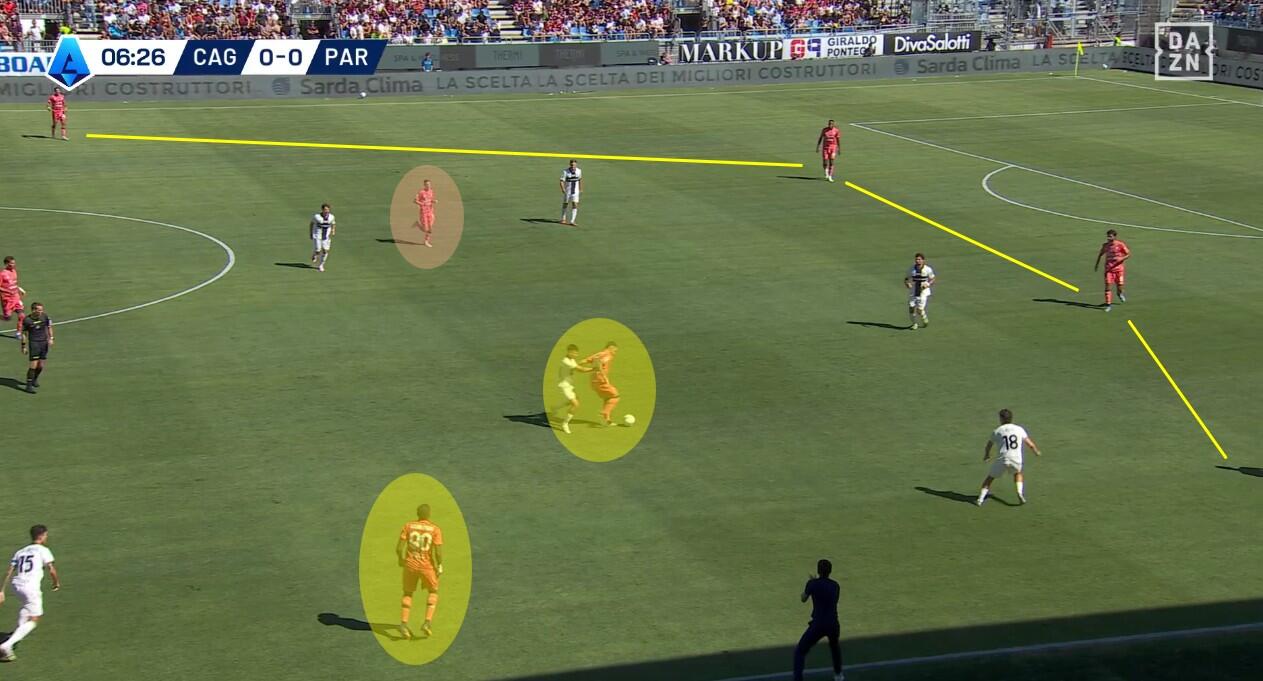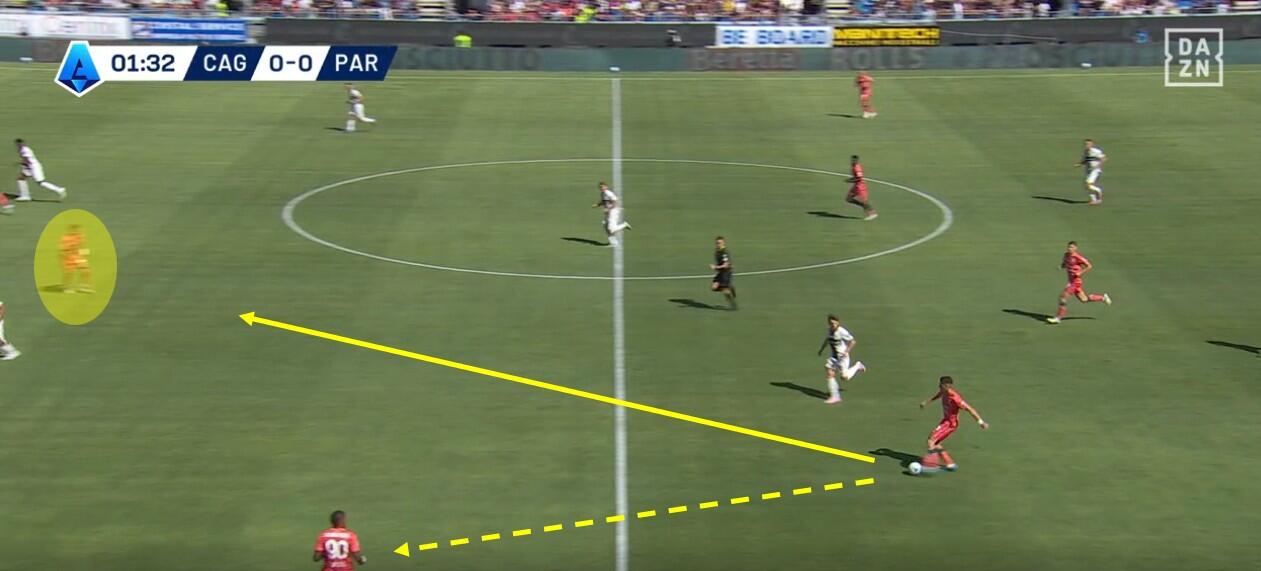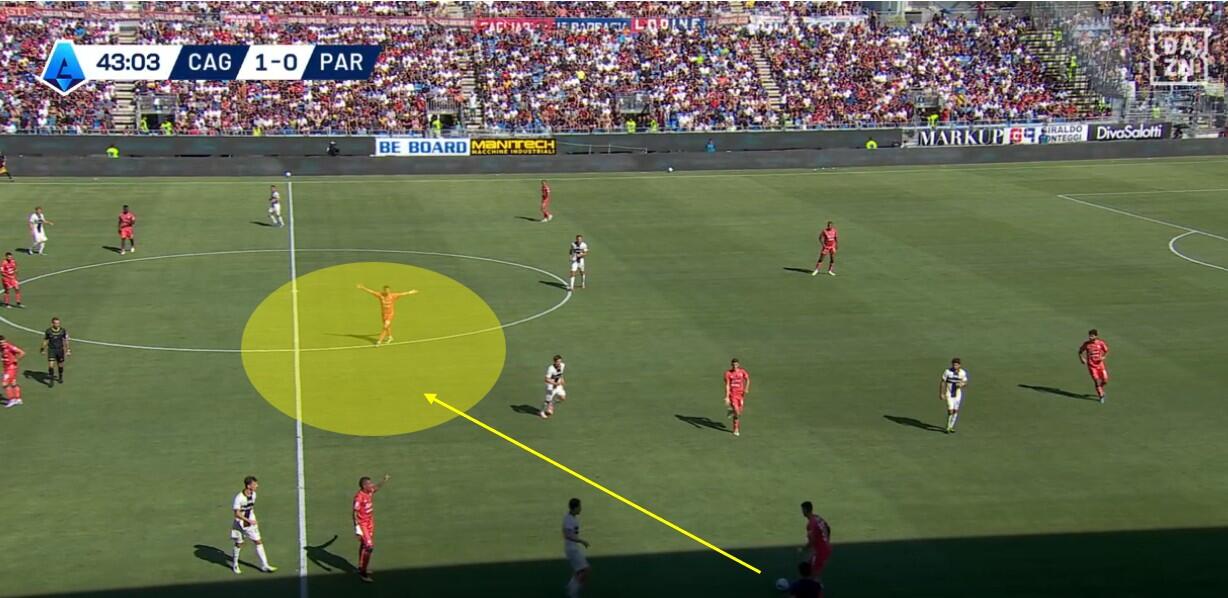 Una delle costanti del Cagliari in costruzione è stata quella del riferimento in regia non statico. Prati come mediano davanti alla difesa in non possesso, ma non unico play designato in quella di possesso. In un calcio che vive di compiti più che di ruoli e nel quale le rotazioni degli interpreti sono quasi la norma, il classe 2003 ravennate è stato spesso il giocatore che dava opzioni in uscita, ma senza limitarsi al lavoro di appoggio. La caratteristica del Cagliari contro il Parma è stata infatti quella dello svuotamento da parte di Prati della zona davanti alla difesa, creando così lo spazio per i movimenti verso la mediana di Gaetano ed Esposito a turno, spesso e volentieri registi occulti nella manovra.