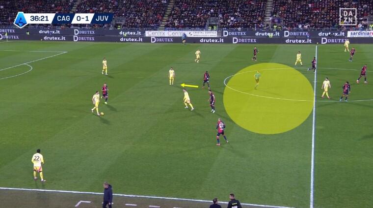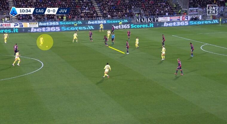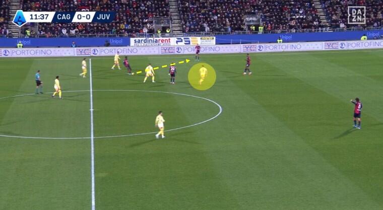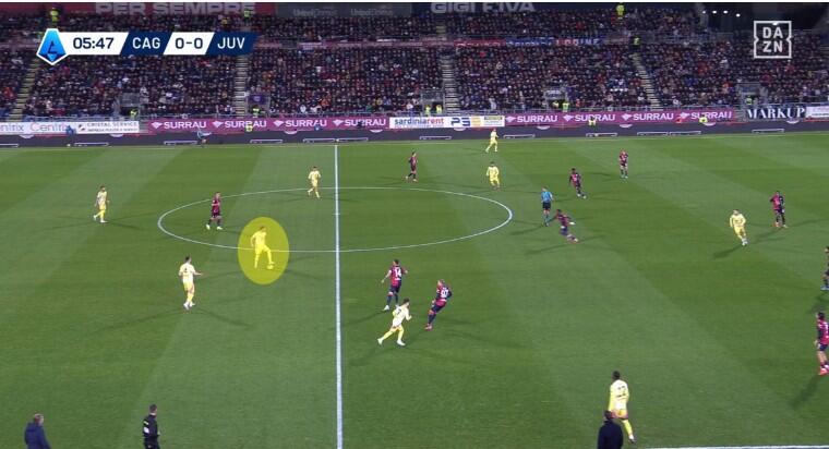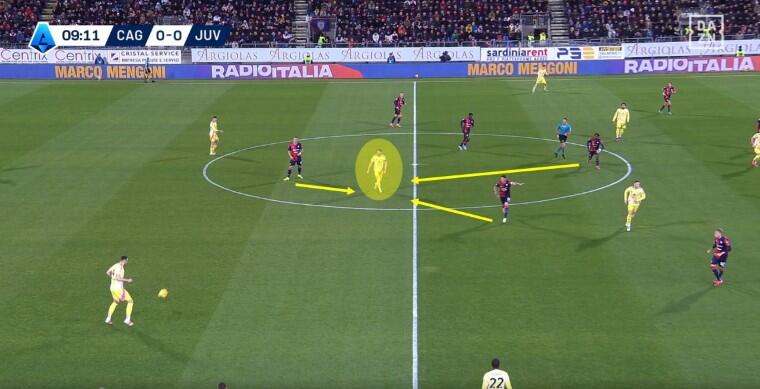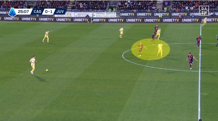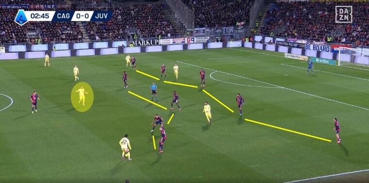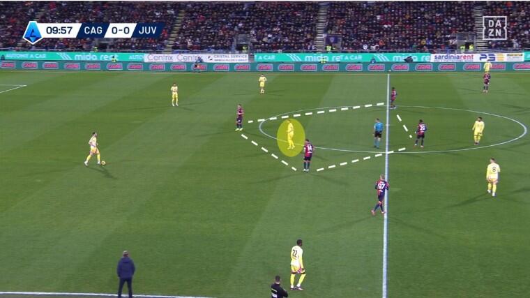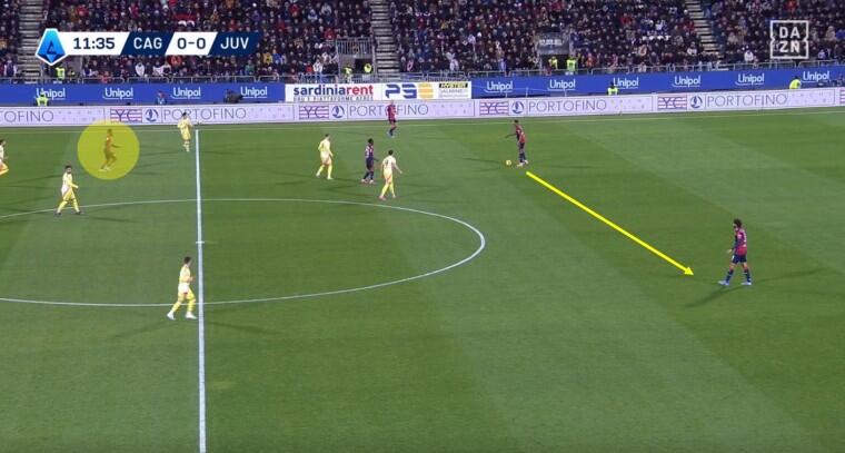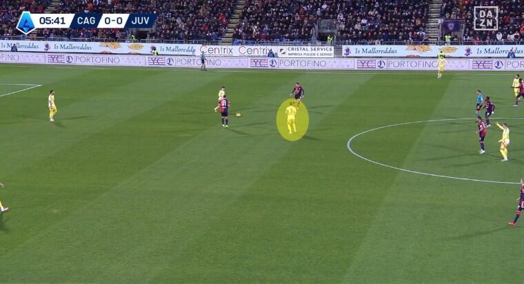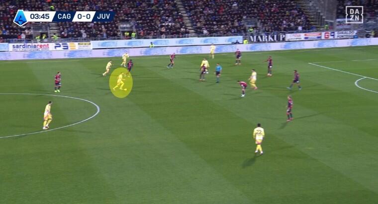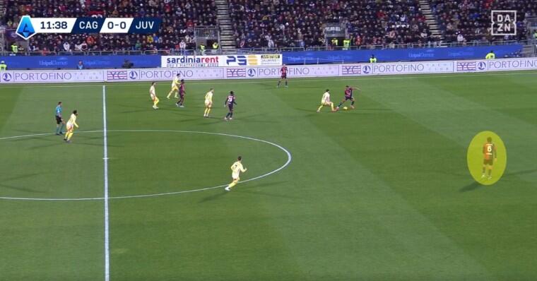Indicative le situazioni che vedevano Locatelli libero in mezzo alle maglie rossoblù. Né compattezza né uomo su uomo, con il risultato che il numero 5 bianconero veniva trovato con facilità tra i vari Piccoli, Makoumbou, Deiola e Adopo. La conseguenza immediata era il tentativo di accorciare dei giocatori del Cagliari, ma con un ritardo che portava Locatelli ad avere diverse opzioni per gestire il possesso con almeno tre compagni liberi di ricevere lo scarico sia sull’esterno che in verticale.