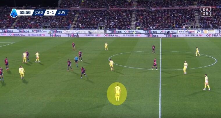 Un’altra scelta che non ha pagato è stata quella che ha visto Piccoli e Deiola andare alti sui due centrali difensivi Gatti e Kelly, lasciando di fatto aperta la linea di passaggio per Locatelli, lasciato sempre libero dai tre mediani. Una situazione che non è dipesa dalla posizione del play bianconero e che si è ripetuta in ogni zona del campo, sia quando la Juventus costruiva dal basso sia quando riusciva a portare la palla nella metà campo del Cagliari.