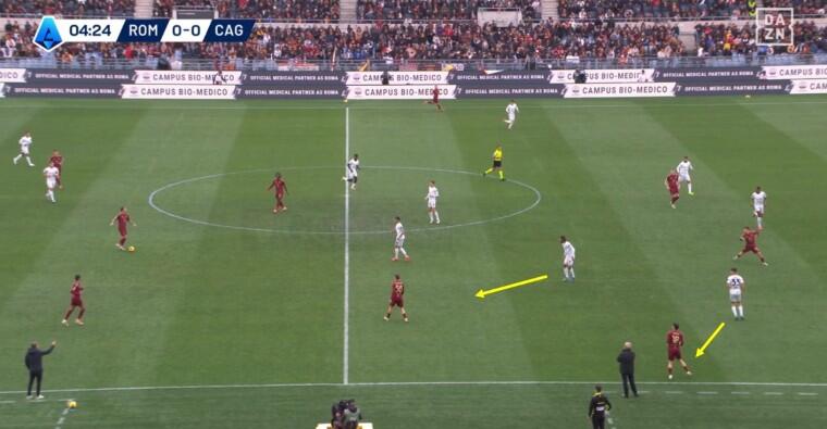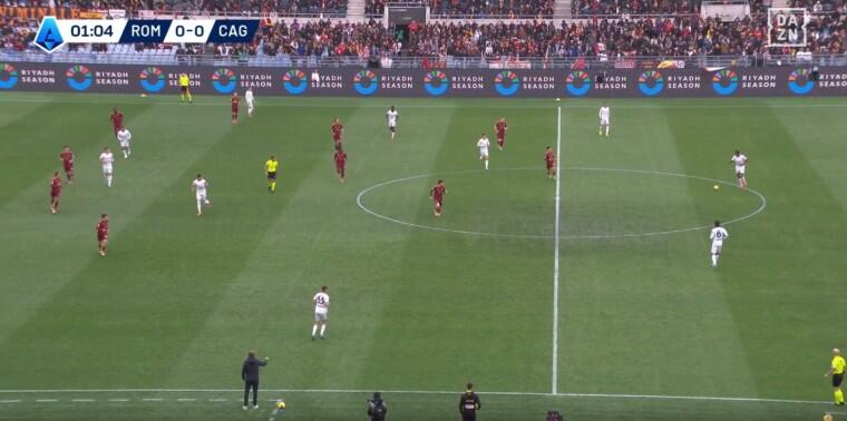 Pur nell’attesa, con il pallino lasciato in mano alla Roma, il Cagliari ha provato a mettere in campo un uomo su uomo misto, una sorta di uomo nella zona nel quale quando c’era la possibilità partiva l’attacco dell’avversario e la ricerca del duello in mezzo al campo. Indicative le posizioni di Luperto e Palomino – e di riflesso quelle di Obert e Zortea – che spesso e volentieri andavano ad aggredire l’uomo nella loro zona fosse esso Soulé o Saelemaekers nella zona difensiva di sinistra o il duo Baldanzi-Angelino a destra. Due catene difensive che hanno funzionato praticamente alla perfezione, creando i presupposti per lasciare praticamente inoperoso Caprile.