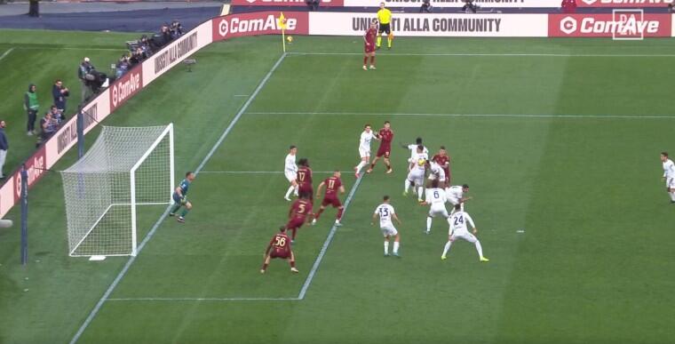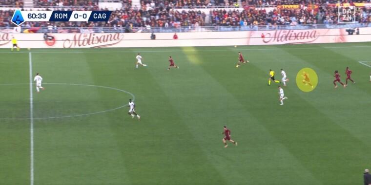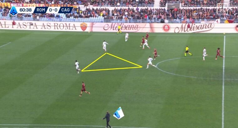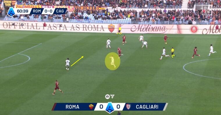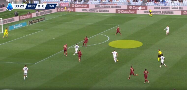 Nell’analizzare la rete che ha deciso la partita ci si è concentrati più sull’angolo dal quale è scaturita che sul come è arrivata la Roma a ottenere il tiro dalla bandierina. L’azione che porta al corner, infatti, è la prima parte di un black-out della fase difensiva rossoblù in una transizione difensiva al quale si aggiunge quello della gestione delle palle inattive. Il Cagliari subisce il gol decisivo di fatto da un angolo a proprio favore, dal quale parte il contropiede giallorosso che porterà al tiro dalla bandierina nell’area opposta. Una squadra che nell’episodio ha dimostrato di non riuscire a mantenere le connessioni tra i singoli per tutti i novanta minuti e di aver bisogno di mantenere la propria struttura compatta per poter ovviare a possibili errori di scelta e valutazione delle individualità .