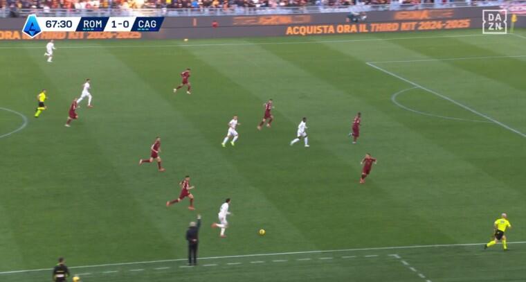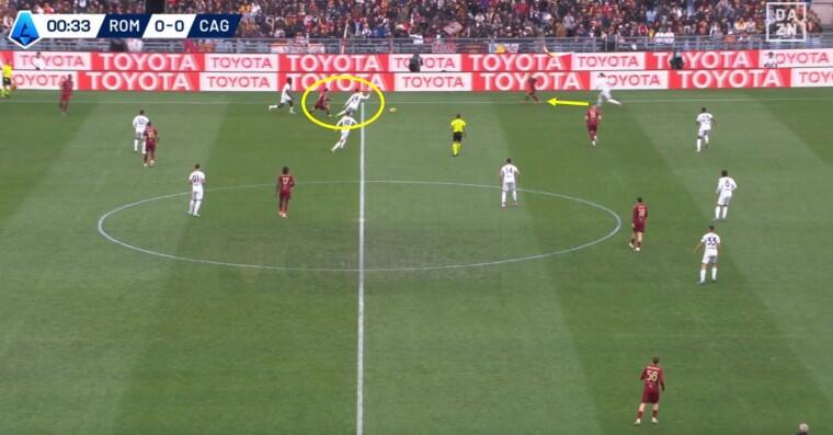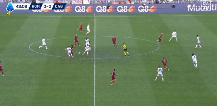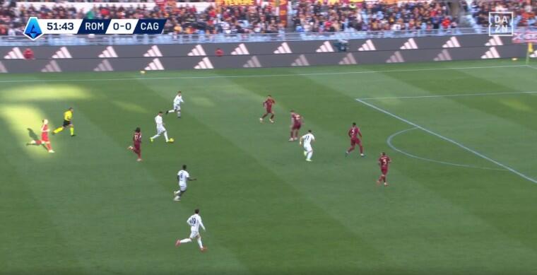 La transizione offensiva parte grazie al lavoro della mediana che attacca il possesso della Roma dopo un’incertezza di Kone. Sono quattro i rossoblù nella zona del pallone, il recupero porta Prati a condurre in verticale per poi trovare perfettamente il corridoio per Zortea. Manca però un aspetto fondamentale nell’attacco del Cagliari, sono infatti pochi gli uomini che accompagnano con i centrocampisti che restano nelle loro posizioni.