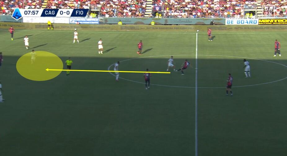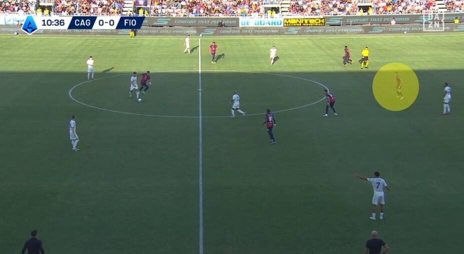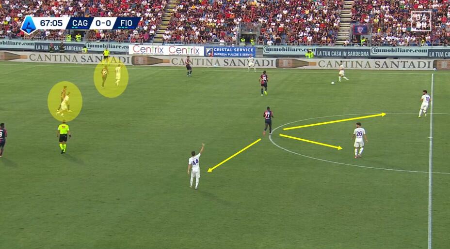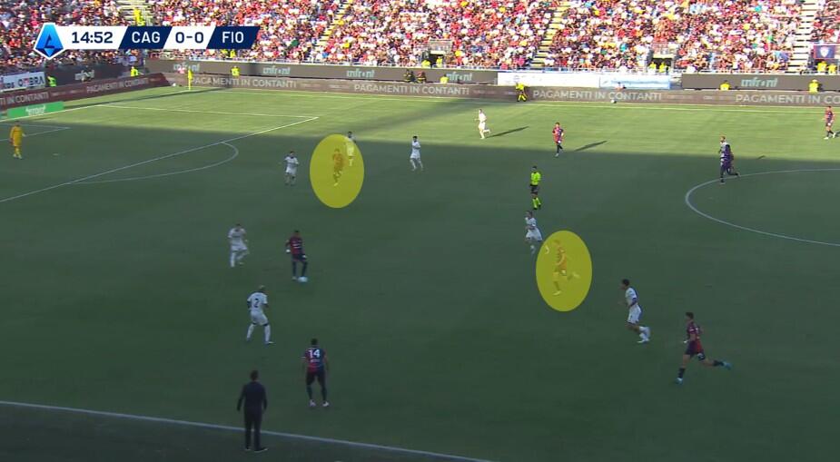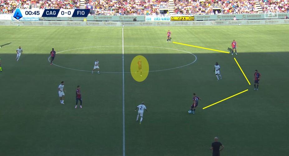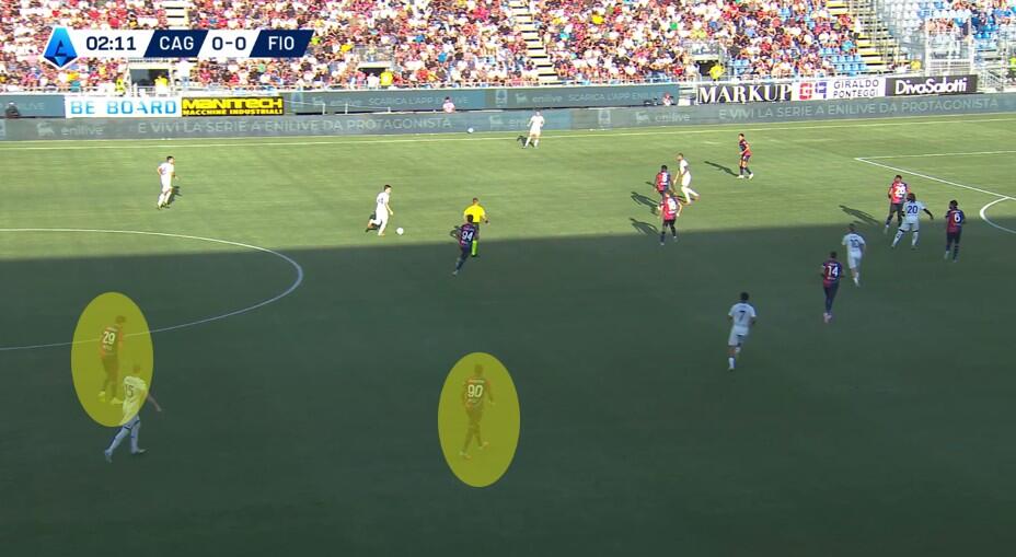 La fase di costruzione ha visto il Cagliari schierarsi con un classico 4+1, con la linea difensiva che, al contrario di quanto visto nella passata stagione e in diverse gare estive (Coppa Italia inclusa) è rimasta con la stessa disposizione anche in fase di non possesso. Zappa come terzino a destra, Obert sul lato opposto, Mina e Luperto i due centrali e Prati a compiere funzioni sia di costruttore davanti alla difesa sia di schermo quando la Fiorentina conduceva il gioco.