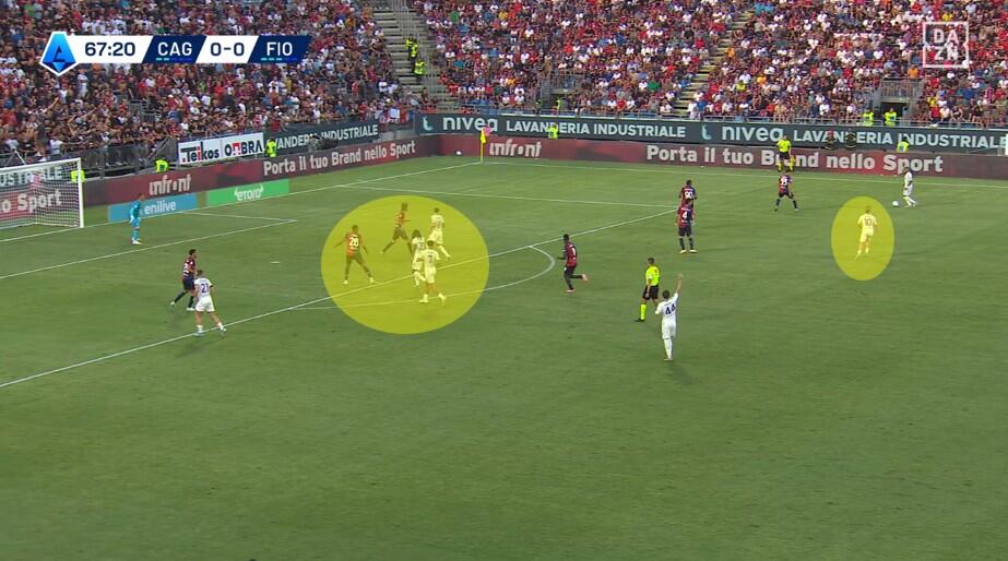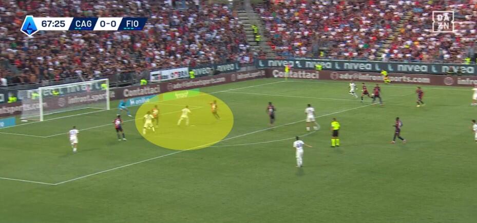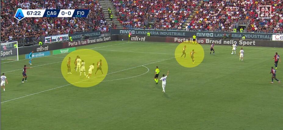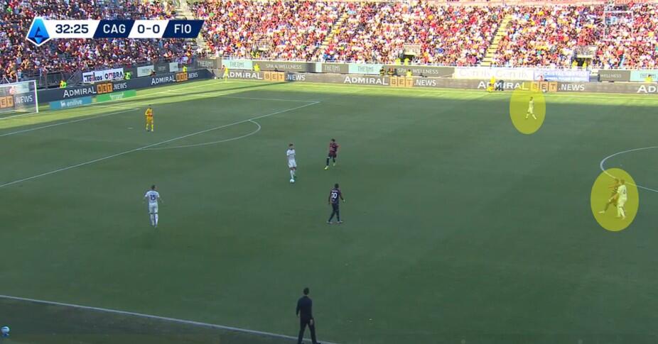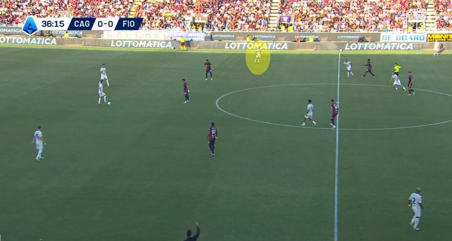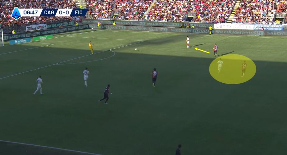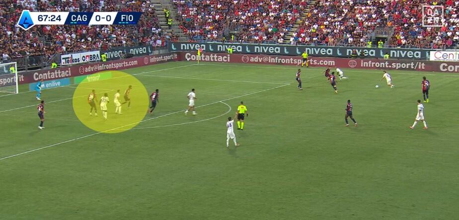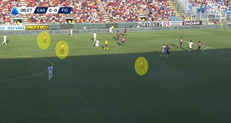 Una volta superata la prima pressione, con la Fiorentina che si approcciava alla trequarti rossoblù, a turno gli attaccanti del Cagliari restavano sopra la linea del pallone senza quasi interessarsi della fase di non possesso. Folorunsho ed Esposito soprattutto si alternavano nell’aiuto ai compagni, con chi dei due restava in avanti a mettere in atto smarcamenti preventivi per la successiva eventuale transizione offensiva.