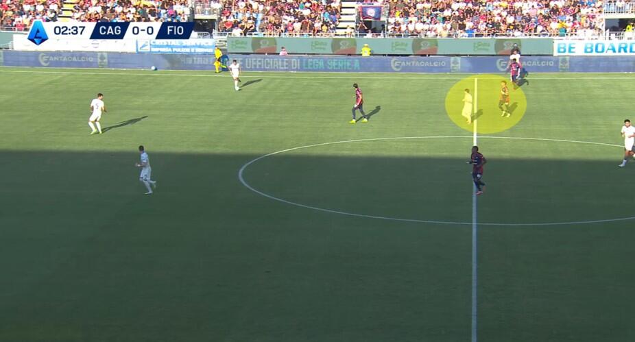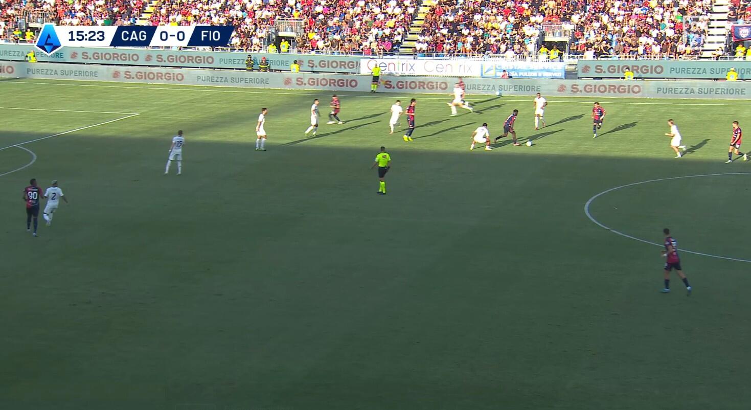 La prima pressione del Cagliari lasciava la costruzione nella fase iniziale, con la Fiorentina che era libera di gestire l’inizio dell’azione da De Gea ai difensori. La strategia pensata da Pisacane ha visto Borrelli occuparsi del centrale della difesa a tre viola, Folorunsho andare su Comuzzo e soprattutto Esposito in marcatura costante sul regista, ossia Fagioli. Con Prati a seguire praticamente a tutto campo Gudmundsson, Deiola a fare altrettanto con Shom e Adopo con Ndour, mentre Zappa attendeva più basso Gosens. Evidente come Pisacane abbia scelto di lasciare libero Ranieri, unica opzione di giocata per la Fiorentina nella prima costruzione.