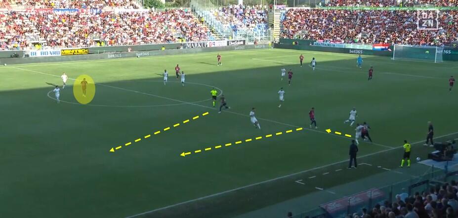 Una delle chiavi tattiche pensate da Pisacane è stata indubbiamente l’utilizzo costante della fascia sinistra come sfogo della manovra. Non solo partendo da destra per poi andare sul lato opposto, ma anche con i lanci di Caprile dalle retrovie e con lo sviluppo verticale grazie al cosiddetto terzo uomo e a continui movimenti senza palla dei vari interpreti. In questo contesto la fisicità di Folorunsho è stata un’arma fondamentale, così come lo svariare tra le linee di Esposito e, infine, la corsa verticale nello spazio degli interni di centrocampo con soprattutto Deiola protagonista. Un’idea che potrebbe svilupparsi con maggiore efficacia una volta recuperati a pieno giocatori come Gaetano, che potrebbe così portare a Folorunsho come mezzala d’inserimento nel compito di terzo uomo che chiude il triangolo lungo e appunto Gaetano a farne le veci per le combinazioni tra le linee con Esposito.