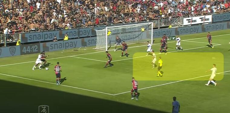 Il due a uno segnato dalla rondinelle diventa una logica conseguenza dell’atteggiamento troppo rinunciatario del Cagliari degli ultimi venti minuti. Il Brescia non crea pericoli, ma quando si resta bassi e vicini alla propria porta l’errore diventa fatale. Sul cross dalla sinistra, infatti, oltre all’inferiorità numerica sul lato opposto, si può notare come Altare compia un errore che già ha commesso in altre partite. Occhi tutti sul pallone, nessuna lettura della possibile evoluzione dell’azione e, infine, l’uomo lasciato sfilare che può raccogliere quasi indisturbato la seconda palla dentro l’area.