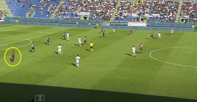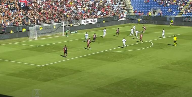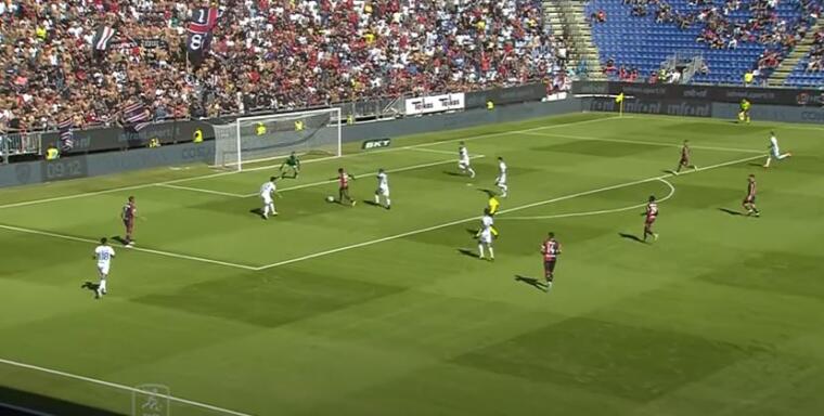 Quando la palla arriva nel cuore dell’area del Brescia sono cinque i giocatori rossoblù pronti a raccogliere il cross basso, sei contando chi il cross lo ha effettuato. Una novità decisiva per creare pericoli reali e per segnare il gol del raddoppio.