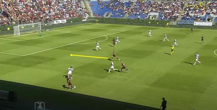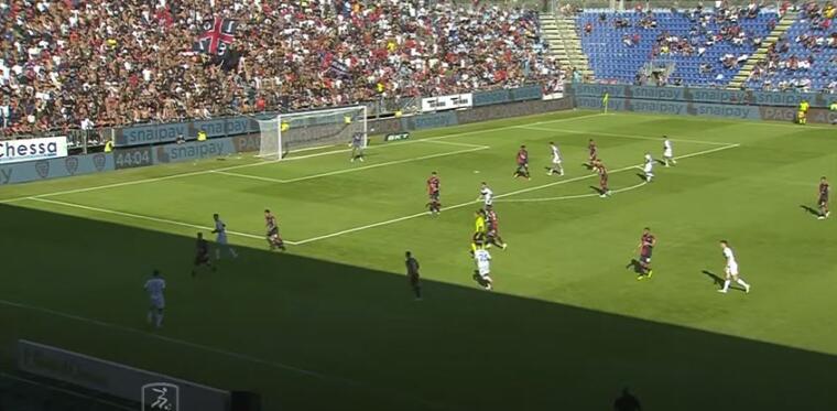 La logica conseguenza è stata quella di una squadra che ha portato in area, grazie al recupero palla alto, molti più giocatori che nel recente passato. Quando Luvumbo riceve da Mancosu, infatti, sia i tre attaccanti che i tre centrocampisti sono negli ultimi 25 metri.