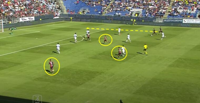 L’ex Benevento, non certamente giocatore di gamba, viene spostato sulla destra di centrocampo, con Mancosu a supporto di Pavoletti e Millico sul lato opposto, mentre i centrali del centrocampo a quattro diventano Makoumbou e Deiola. La squadra rossoblù prova a restare sempre alta, almeno nei primi minuti che seguono la modifica, ma progressivamente abbassa le linee.