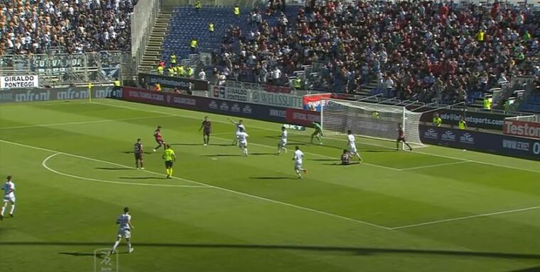 Nonostante l’indecisione ci sarebbe l’opportunità di evitare il gol, ma la squadra è schiacciata a difesa della porta e nessuno anticipa quanto sta per accadere all’altezza del dischetto. Spazio ampio, né i difensori né i centrocampisti accorciano verso gli undici metri, Deiola esce in ritardo girandosi parzialmente al momento del tiro di Olzer. Tutto troppo semplice, ma comunque prevedibile vista la disposizione troppo bassa delle linee del Cagliari.