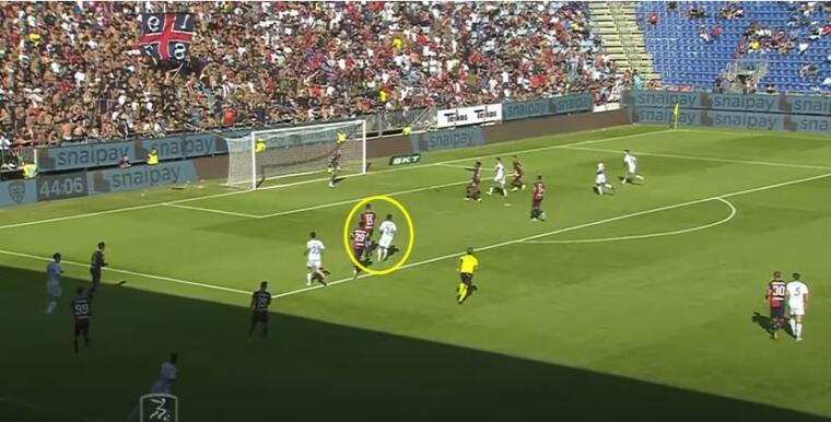 Il gol del raddoppio nasce proprio da un reparto, quello di centrocampo, pronto ad accompagnare l’azione in maniera compatta. Non solo, ma la presenza di Filippo Falco ha dato al Cagliari quel tipo di giocatore in grado di puntare gli avversari creando superiorità numerica e, nel caso della rete di Deiola, lo spazio necessario per la sovrapposizione di Di Pardo.