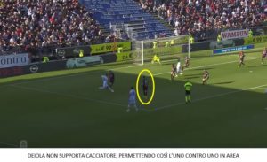Nel lato destro Deiola non ha adeguatamente supportato Cacciatore, sono mancati distanze e raddoppi e così gli avversari hanno avuto vita facile dall’alto delle loro capacità tecniche e grazie a inserimenti senza palla e sovrapposizioni.