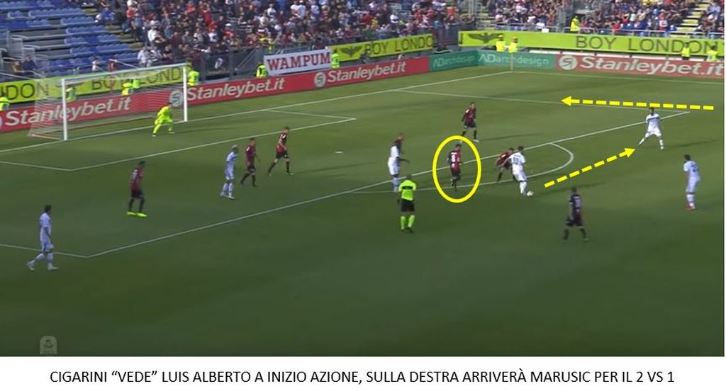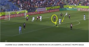 Nel gol di Luis Alberto si notano tre situazioni che racchiudono le difficoltà del Cagliari non solo contro i laziali, ma anche in tante altre occasioni: l’azione che passa da un lato all’altro del campo, con la fase difensiva in difficoltà nello scivolare assecondandola; i due contro uno subiti sugli esterni, vittime sacrificali di un rombo che chiede alle mezzali un lavoro improbo; la linea difensiva troppo bassa e il regista disattento sul rimorchio ai sedici metri.