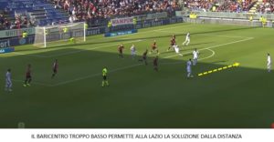 Come a Napoli così contro la Lazio, con gli avversari che prendevano campo il Cagliari ha reagito abbassando ancora di più il baricentro, ma al contrario della gara del San Paolo questa volta gli avversari hanno anche provato la soluzione dalla distanza. La traversa di Badelj, con deviazione in tuffo di Cragno, dimostra quanto descritto: difesa e centrocampo sono raccolti nei sedici metri, Deiola e Padoin sono in linea con i 4 difensori, Cigarini e Barella in ritardo nel salire verso i rispettivi avversari.