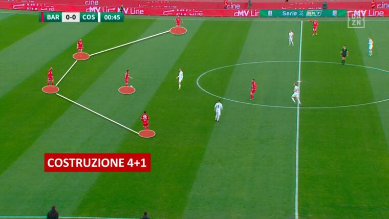 Così come il Bari ha un teorico vantaggio in mezzo al campo, il Cagliari ne ha uno evidente sulle fasce laterali. Il 4-3-1-2 dei pugliesi manca naturalmente di ampiezza nelle due fasi, mentre il 3-5-2 (o anche eventualmente 3-4-1-2 con Mancosu) fa della sua forza il focus sull’esterno. Impostando con continuità l’azione sulle fasce, la squadra di Mignani potrebbe faticare nello scivolare con ordine in orizzontale, perché le mezzali dovrebbero coprire tantissimo campo. Una buona soluzione per punire questa difficoltà in ampiezza potrebbe essere quella di costruire su una fascia e obbligare il Bari a fare densità su quel lato, per poi cambiare rapidamente gioco sul versante opposto dove ci sarà più spazio. L’idea migliore sarebbe probabilmente quella di portare il gioco da destra verso sinistra, perché Azzi ha le capacità in dribbling per far malissimo a chiunque in 1vs1.