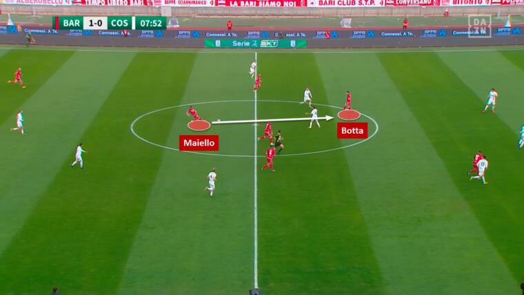 Un ormai atavico problema del Cagliari riguarda le difficoltà che incontra quando affronta una squadra che giocano con un vertice basso di qualità . In questo senso, l’esempio più chiaro e più recente può essere la gara casalinga contro la Spal, in cui il regista Prati ha giocato un’infinità di palloni e con grande proprietà tecnica. Ranieri dovrà quindi trovare delle contromisure efficaci per cercare di limitare l’apporto di Maiello, ma non sarà un compito facile perché i pugliesi hanno una naturale superiorità numerica in mezzo al campo: 4 centrocampisti (3 + 1 trequartista) contro 3. Ipotizziamo che il Cagliari riproponga il suo classico 3-5-2. Qualora Ranieri dovesse optare per un pressing portato dalle due punte sui due centrali del Bari, con le due mezzali che prendono a uomo le mezzali avversarie, Makoumbou potrebbe faticare nel fare la spola tra la marcatura in avanti di Maiello e quella alle sue spalle di Botta.
