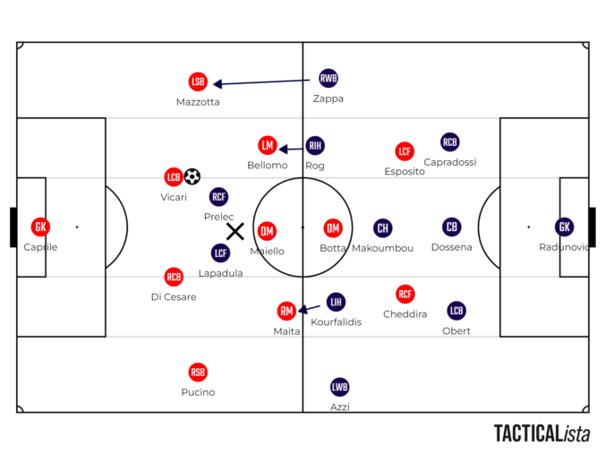 Un approccio più accorto potrebbe essere quello che vede il Cagliari mantenere un blocco medio, quindi una via di mezzo tra il pressing alto e un atteggiamento passivo. Per limitare la superiorità numerica a centrocampo Lapadula e Prelec potrebbero giocare molto stretti per oscurare ogni linea di passaggio verso Maiello, obbligando il Bari a giocare su uno dei due terzini. Da quella situazione l’esterno di zona, Zappa o Azzi, dovrebbe uscire in pressione sul terzino, mentre la mezzala mantenere la marcatura sulla mezzala opposta. Inoltre, sarebbe necessario un approccio molto aggressivo da parte dei due braccetti, specialmente su Esposito che ha la tendenza a venire incontro per giocare tanti palloni.