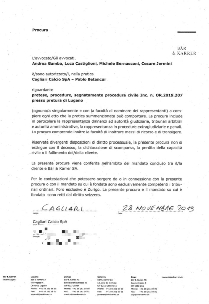 IL MANDATO RIMESSO – C’è però anche una terza situazione che va avanti ormai da almeno un mese, riguardante la richiesta di annullamento del contratto da parte di Nández per presunte noie contrattuali legate alla retribuzione, come abbiamo già ampiamente riferito le scorse settimane: istanza che parte dalla lettera inviata dal giocatore alla società rossoblù con data dello scorso 17 settembre 2019. El Léon e Bentancur, in questo caso, si erano affidati allo studio legale Macciotta per curare i propri interessi ma, come anticipato dall’Unione Sarda lo scorso 29 dicembre, gli avvocati hanno comunicato il 30 dicembre l’intenzione di abbandonare la causa e rimettere così il mandato. “Egregio Signor Nandez – recita la nota – nel fare seguito alla corrispondenza già reiteratamente intervenuta con il suo procuratore sig. Pablo Bentancur, formalizzo con la presente la mia rinuncia al mandato professionale da Lei conferitomi in forma scritta”. Dichiarazione vergata (in blu) dall’avvocato Giuseppe Macciotta, principe del foro cagliaritano e già difensore di personaggi di spicco della politica regionale come Renato Soru e Massimo Zedda, oltre a essere presidente del Tennis Club di Cagliari.