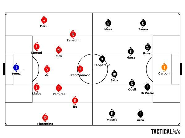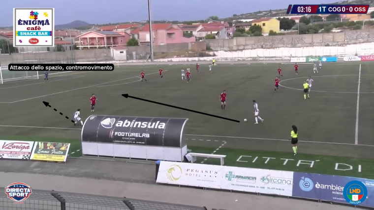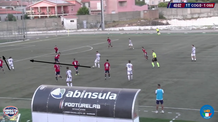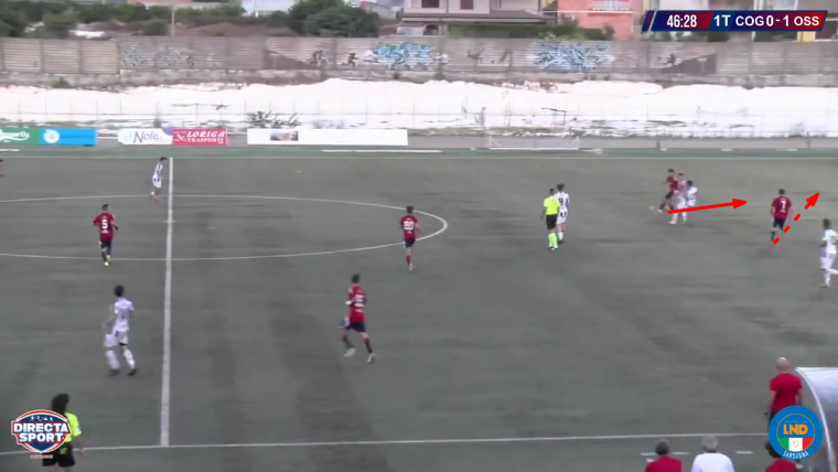 Le funzioni degli esterni offensivi sono quelli di muoversi in ampiezza assoluta, andando ad attirare (o fissare) il proprio marcatore diretto e creare lo spazio tra centrale e terzino, spazio che viene attaccato dall’ex Torres con continuità: dal suo lato arrivano le migliori occasioni del primo tempo, che costruisce per sé ma anche per i compagni.