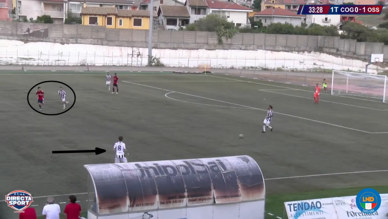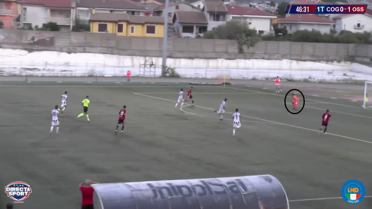 I 3 centrocampisti dell’Ossese non sono però mai fermi: scambiano le funzioni durante la gara, anche per ovviare all’atteggiamento del Coghinas: la squadra di mister Congiu infatti, dopo una buona partenza nei primi 10 minuti di gara, cerca di mantenersi compatta e lasciare il pallino del gioco all’avversario. Gueli viene sempre marcato a uomo, in particolare quando orbita nella zona del classe 2007 Bo, che lo segue quasi come un’ombra.