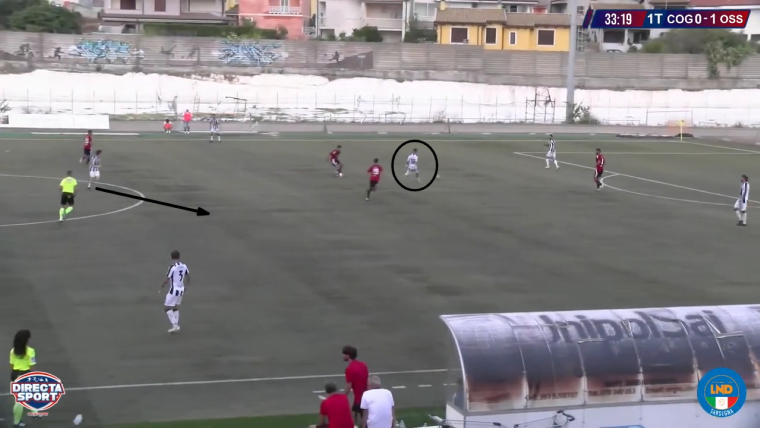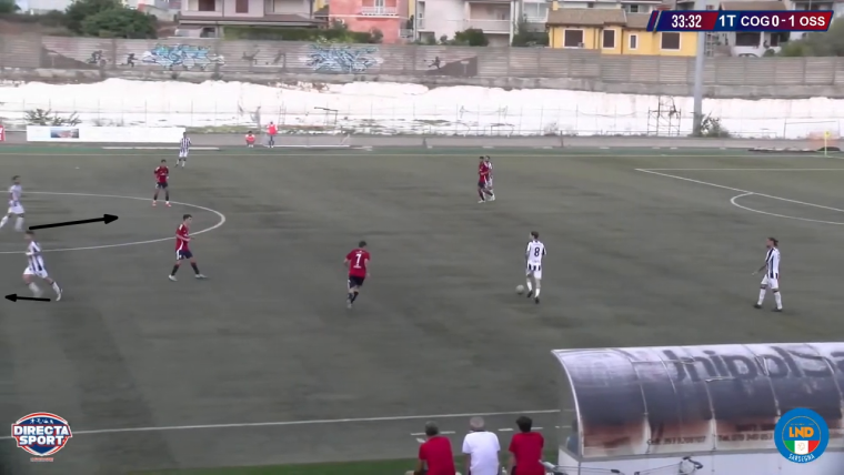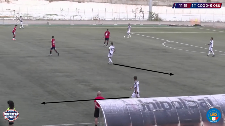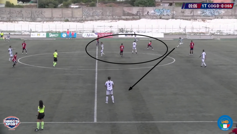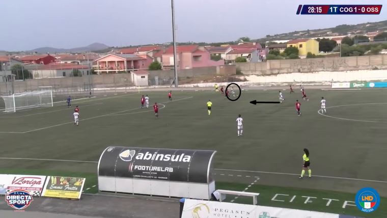 In questa situazione è Saba che assume le funzioni di costruttore di gioco, ma è subito marcato a uomo. Nurra quindi apre il campo in ampiezza, con Gueli che invade (fuori schermo) la rifinitura. In questo modo il giro palla difensivo premia il numero 8 bianconero.