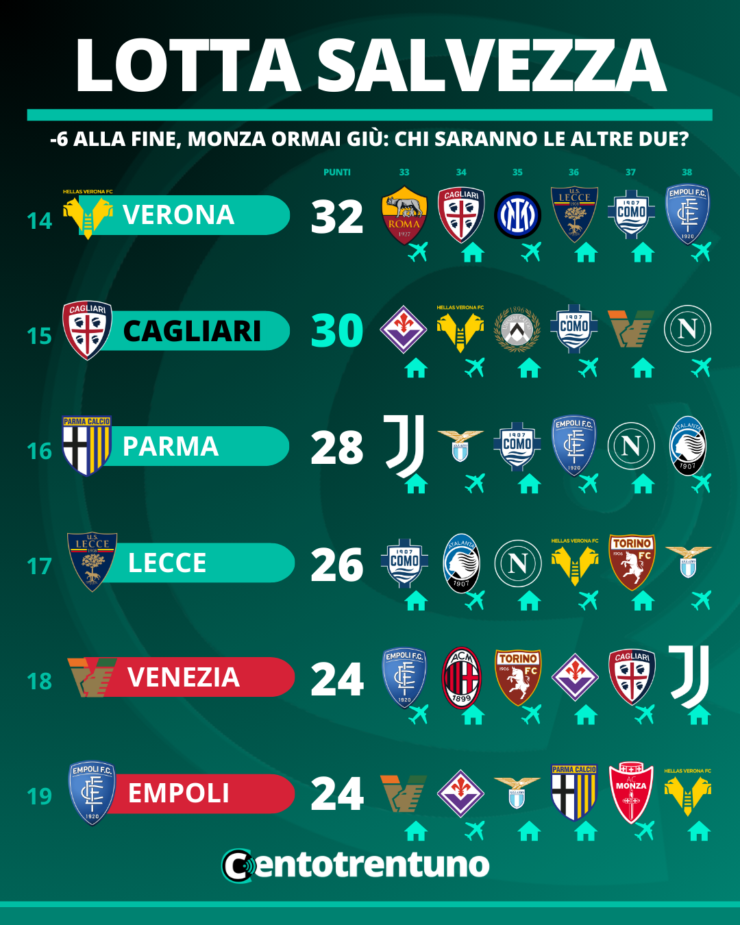 Sei giornate al termine della Serie A, cinquecentoquaranta minuti per stabilire chi potrà festeggiare la salvezza e chi, al contrario, dovrà prepararsi per una nuova stagione in cadetteria. Due le poltrone rimaste che nessuna delle concorrenti vorrà occupare, con il Monza che ha ormai virtualmente salutato dopo tre campionati consecutivi la massima serie. Solo la matematica tiene in vita i brianzoli di Alessandro Nesta, così come solo la matematica non ha ancora sancito la permanenza in Serie A del Como da neopromossa. Dal Verona con 32 punti alla coppia Venezia-Empoli con 24, passando per il Cagliari a 30, il Parma a 28 e il Lecce a 26: sono rimaste in sei a contendersi la salvezza, con sei scontri diretti ancora da giocare e una quota che potrebbe aggirarsi tra i 32 e i 34 punti. Andiamo dunque ad analizzare il calendario di ogni squadra impegnata nella battaglia per non retrocedere, partendo dal basso per salire fino all’Hellas, ricordando che i valori attuali potrebbero cambiare da qui all’ultima giornata a seconda delle differenti motivazioni di chi affronterà le diverse concorrenti, perché chi in questo momento ha ancora obiettivi di classifica potrebbe non averne tra un mese, così come le gare contro il Verona di Empoli, Lecce e Cagliari potrebbero non essere più scontri diretti quando verranno disputate.