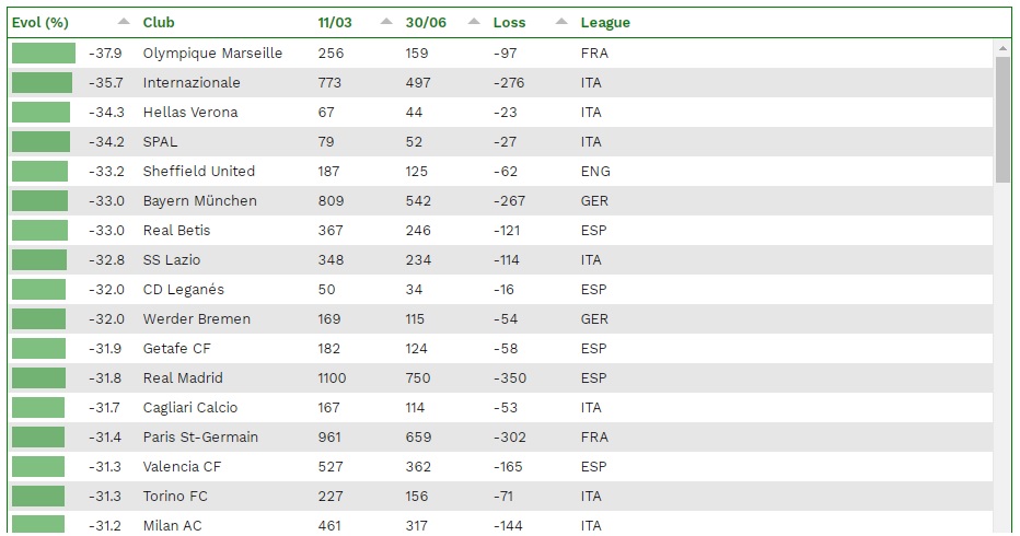 L’organismo internazionale ha valutato quanto i club perderebbero sul valore della propria rosa in caso in cui le partite non verranno disputate e nessuno dei contratti in essere venga esteso oltre la fatidica data del 30 giugno. Lo studio fatto dal CIES ha preso in considerazione i diversi aspetti che influenzano nella valutazione di mercato, come l’età dell’atleta, la durata del contratto, la carriera e le prestazioni recenti; meno un giocatore è sceso in campo durante la stagione e più la scadenza del suo contratto è vicina, maggiore sarà la perdita sul singolo valore di mercato.