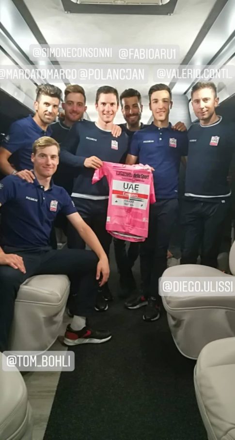 La permanenza in Piemonte è stata anche l’occasione per salutare i compagni di squadra impegnati nelle prime tappe montane del Giro d’Italia. Finora la corsa della UAE Team Emirates è stata da incorniciare, con i giorni in maglia rosa di Valerio Conti e Jan Polanc e una vittoria di tappa del velocista Gaviria a Orbetello. Il Cavaliere dei Quattro Mori, come si vede sui social dal team diretto da Beppe Saronni, ha posato nel pullman della squadra tra i compagni per una foto con la maglia rosa indossata dallo sloveno al termine della dodicesima frazione. Chissà che non sia di buon auspicio per il prossimo Giro 2020 del sardo…