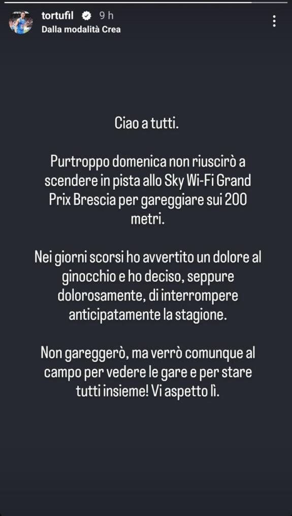 Per Tortu è stato decisivo un dolore al ginocchio che non ha consentito all’atleta azzurro di partecipare alla competizione e in particolare nei 200 metri. L’annuncio è arrivato dallo stesso Tortu con un post su Instagram, dove il velocista ha spiegato i motivi di tale decisione. Niente confronto diretto, quindi, per il velocista originario di Tempio contro l’astro nascente della velocità, ovvero il botswano classe 2003 Letsile Tebogo, fresco campione olimpico sui 200 metri piani a Parigi 2024 nonché attuale primatista africano della specialità e reduce da quattro successi consecutivi in Diamond League. “Ciao a Tutti. Purtroppo domenica non riuscirò a scendere in pista allo Sky Wi-Fi Grand Prix Brescia per gareggiare sui 200 metri. Nei giorni scorsi ho avvertito un dolore al ginocchio e ho deciso, seppure dolorosamente, di interrompere anticipatamente la stagione. Non gareggerò, ma verrò comunque al campo per vedere le gare e per stare tutti insieme! Vi aspetto lì”, ha scritto il portacolori delle Fiamme Gialle sui social.