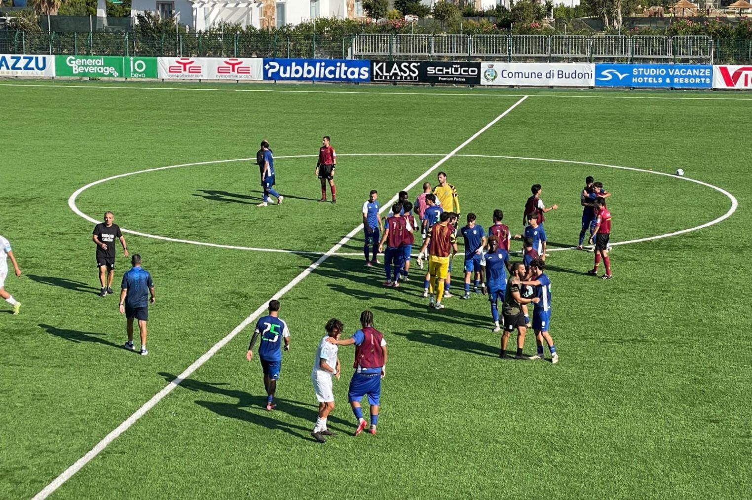 Si respira aria di derby fin dalle prime battute dell’incontro, con il Pasquale Pinna teatro di un match intenso. Protagonista dell’incontro nella fase iniziale è Furijan che prima al 7’ commette un fallo da dietro su Tuveri e viene ammonito, poi sei minuti più tardi, allargando il gomito su Piseddu, riceve il secondo giallo ed è costretto ad abbandonare il campo lasciando il Budoni in dieci uomini. L’equilibrio regna nella prima mezzora, ma a sbloccare la gara sono gli ospiti al 31’. Pinna inventa un gran cambio gioco per Gibilterra, che salta l’avversario e crossa dalla linea di fondo per Suazo, abile nel farsi trovare nel posto giusto e al momento giusto per regalare la rete del vantaggio al Monastir. Ultimi minuti che scorrono senza particolari occasioni con le due squadre che rientrano negli spogliatoi sul risultato di 0-1. Nella ripresa è ancora la formazione campidanese a essere protagonista con il figlio d’arte Suazo che al 57’ scalda i guantoni di Tirelli che con un grande intervento gli nega la gioia della doppietta. I ragazzi allenati da Angheleddu non mollano di un centimetro e continuano a spingere alla ricerca del raddoppio che arriva pochi minuti più tardi al 59′. Sugli sviluppi di un corner Aloia sguscia tra le maglie avversarie e si fa trovare bene sul primo palo, girando di precisione in caduta e firmando il raddoppio. Il Budoni resta in nove al 61’: VÃctor Gómez stende duramente Cortinovis e riceve il rosso diretto. Gli ospiti entrano in modalità gestione e controllo con il Budoni che con due uomini in meno fatica a riportare nei giusti binari la gara.