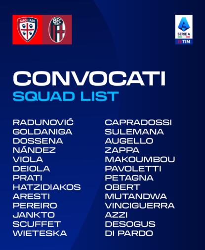 Sono 26 i convocati scelti dal tecnico del Cagliari, Claudio Ranieri, in vista del match casalingo dell’Unipol Domus contro il Bologna in programma domani, domenica 14 gennaio, con calcio d’inizio alle ore 15.00 e valido per il ventesimo turno della Serie A 2023-2024.