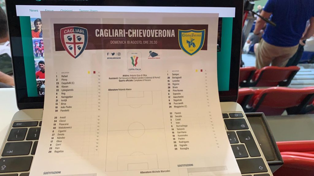 20.10 – Benvenuti dalla Sardegna Arena dove tra circa venti minuti scenderanno in campo Cagliari e Chievo, per il terzo turno preliminare di Coppa Italia.