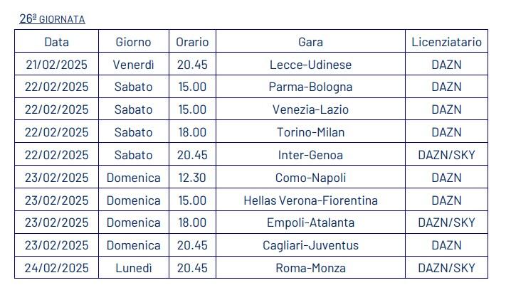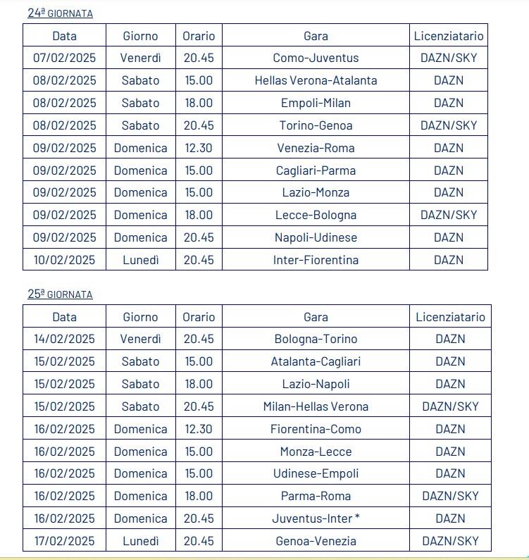 Due gare casalinghe e la difficile trasferta di Bergamo per gli uomini di Nicola che faranno seguito alla gara contro la Lazio di lunedì 3 febbraio che chiuderà il 23° turno che parte con l’anticipo tra Parma e Lecce. Nel 24° turno saranno proprio i ducali gli avversari dei rossoblù alla Unipol Domus con la partita in programma domenica 9 febbraio alle ore 15.00 e che sarà trasmessa solo da Dazn. La sfida del Gewiss Stadium contro l’Atalanta è stata invece schedulata per sabato 15 febbraio alle ore 15.00, anche questa gara sarà trasmessa solo da Dazn. L’attesa partita contro la Juventus sarà invece la chiusura di domenica 23 febbraio: gara in programma alle ore 20.45 che prevede solo la diretta di Dazn. Di seguito i turni completi.