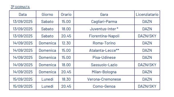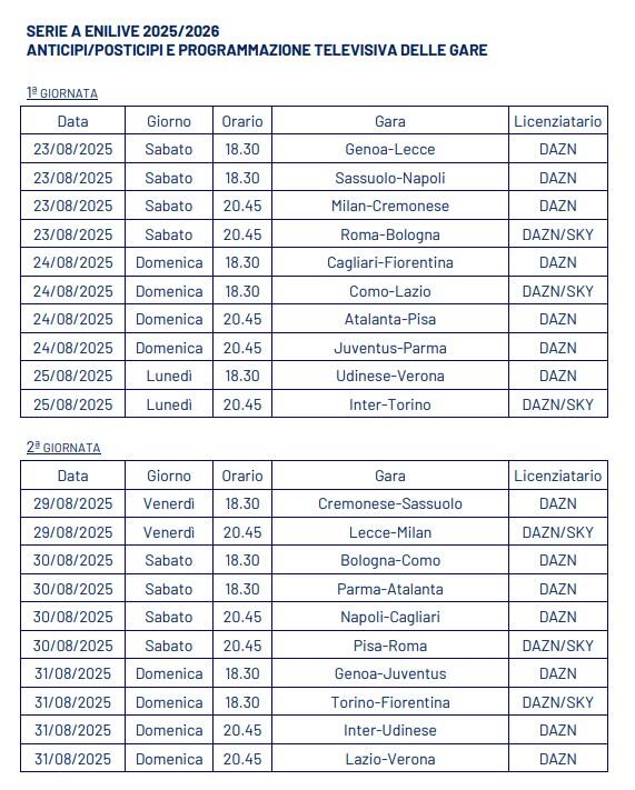 Di seguito il programma completo delle prime tre giornate di Serie A.