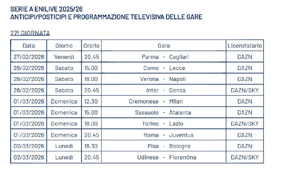 Tramite un comunicato ufficiale, la Lega Serie A ha reso noti gli orari della ventisettesima giornata di campionato, in programma tra il 27 febbraio e il 2 marzo.