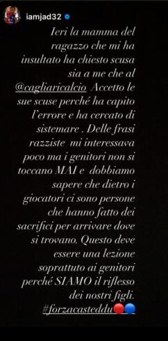 “Ieri la mamma del ragazzo che mi ha insultato ha chiesto scusa sia a me che al Cagliari Calcio. Accetto le sue scuse perché ha capito l’errore e ha cercato di sistemare. Delle frasi razziste mi interessava poco, ma i genitori non si toccano mai e dobbiamo sapere che dietro i giocatori ci sono persone che hanno fatto dei sacrifici per arrivare dove si trovano. Questa deve essere una lezione soprattutto ai genitori, perché siamo il riflesso dei nostri figli. #forzacasteddu”.